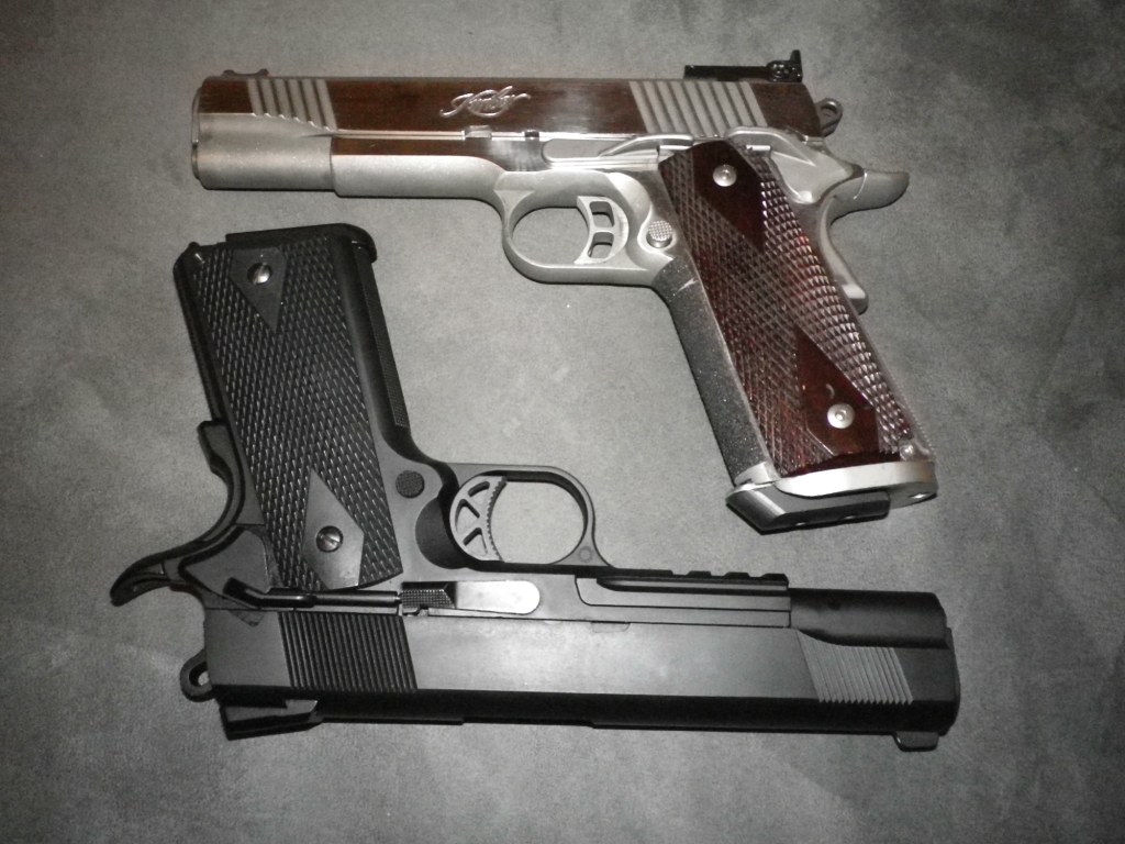 Ježíšek přišel letos už v září Objednal jsem nakonec tuhle. Je to moje první AS, takže můžu srovnávat jen s "ostrou". Jak jsem už psal - snažil jsem se na tréning sehnat co nejpodobnější kousek. První dojem hned z krabice bylo "kruci, je nějaká lehká". No bodejť - zatímco u "ostrých" se obvykle udává hmotnost prázdné zbraně, udávaných 960 g u AS je včetně zásobníku. Ostrý Kimber váží prázdný 1074 g a včetně zásobníku s 8 kousky .45 ACP 1315 g. Airsoft Kimber váží prázdný 756 g a včetně zásobníku 960. Kdo má zbraň často v ruce, hned to pozná. Ale co, na cvičení postačí. Druhý dojem - slícování. Obrovský rozdíl oproti ostré. Opravte mě, jestli se pletu, ale cestou ke zpřesnění není jen těsnější hlaveň, ale i její uložení (u airsoftu je to hned ve 3 místech - vložná hlaveň/vnější hlaveň/objímka). Faktem ale je, že s airsoftem se (kromě kluků asijskejch) na 25m asi nikdo nesnaží udělat 4cm opsané kružnice  Malé zklamání je funkčnost - jeden zásobník je dost nepoužitelný, citelně kolísá úsťová rychlost až do takové míry, že zbraň občas nepřetáhne závěr. Po natažení rukou zase normálně vystřelí několik ran, pak znovu zádržka. Po 15-20 ranách je třeba doplnit plyn. Zavolám do obchodu, uvidíme. Druhý zásobník bez problému, na jedno naplnění dá cca 30 ran. Přesnost - kuličky 0,2g ICS na 6m 2-3 cm. Z krabice nastřelení výškově OK, stranově 1cm doprava - doštelujem... Na moje potřeby zatím naprosto dostatečné. Jen pro srovnání - jsou si na první pohled fakt hoooodně podobné - naštěstí mají jinou barvu, tak si je nespletu