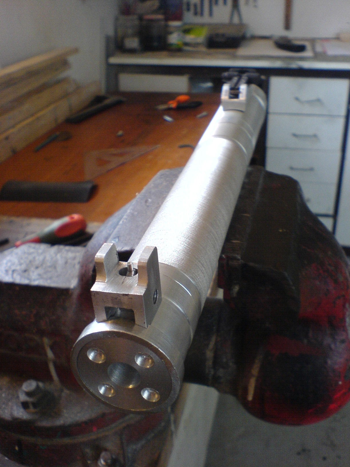 Fandím každýmu kdo se do toho dá. Sám dobře vím kolik to dá práce a nervů (já sám jsem tu pušku chtěl vyhodit oknem tak 100X)  Moje VSS byla taky první pokus stavby a rozhodně nejsem žádný technik nebo konstruktér. S odhledem jsem rád, že jsem začal u rysovacího prakna. Jak jsem začal s výrobou já? Prvně jsem udělal všechny soustružené věci a pak přišel na řadu rám pušky (ten mi samozřejmě trval nejdéle). Pažba a předpažbí jsem řešil nakonec (myslím že každýho kdo vyrábí VSS láká prvně vyrobit pažbu, ale to je podle mě velká chyba). Mimchodem, vyrobit předpažbí je podle mě o 100% složitěší něž pažba (je to mrtě složitý díl). Rád poradím, ptejte se