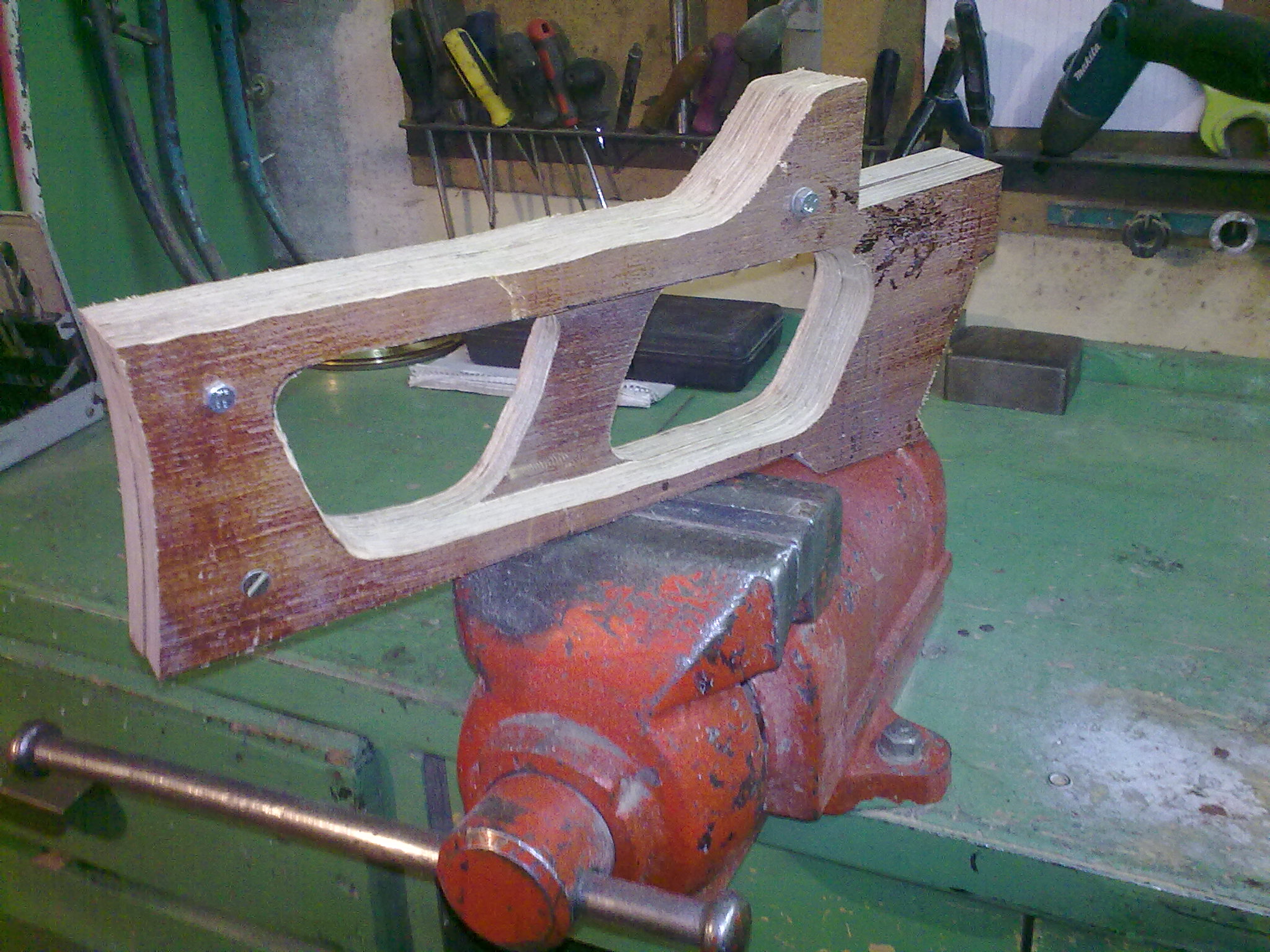 Tak tady je další můj postup, pažba je udělána na hrubo z 2 částí překližky bez povrchové úpravy. Příloha: