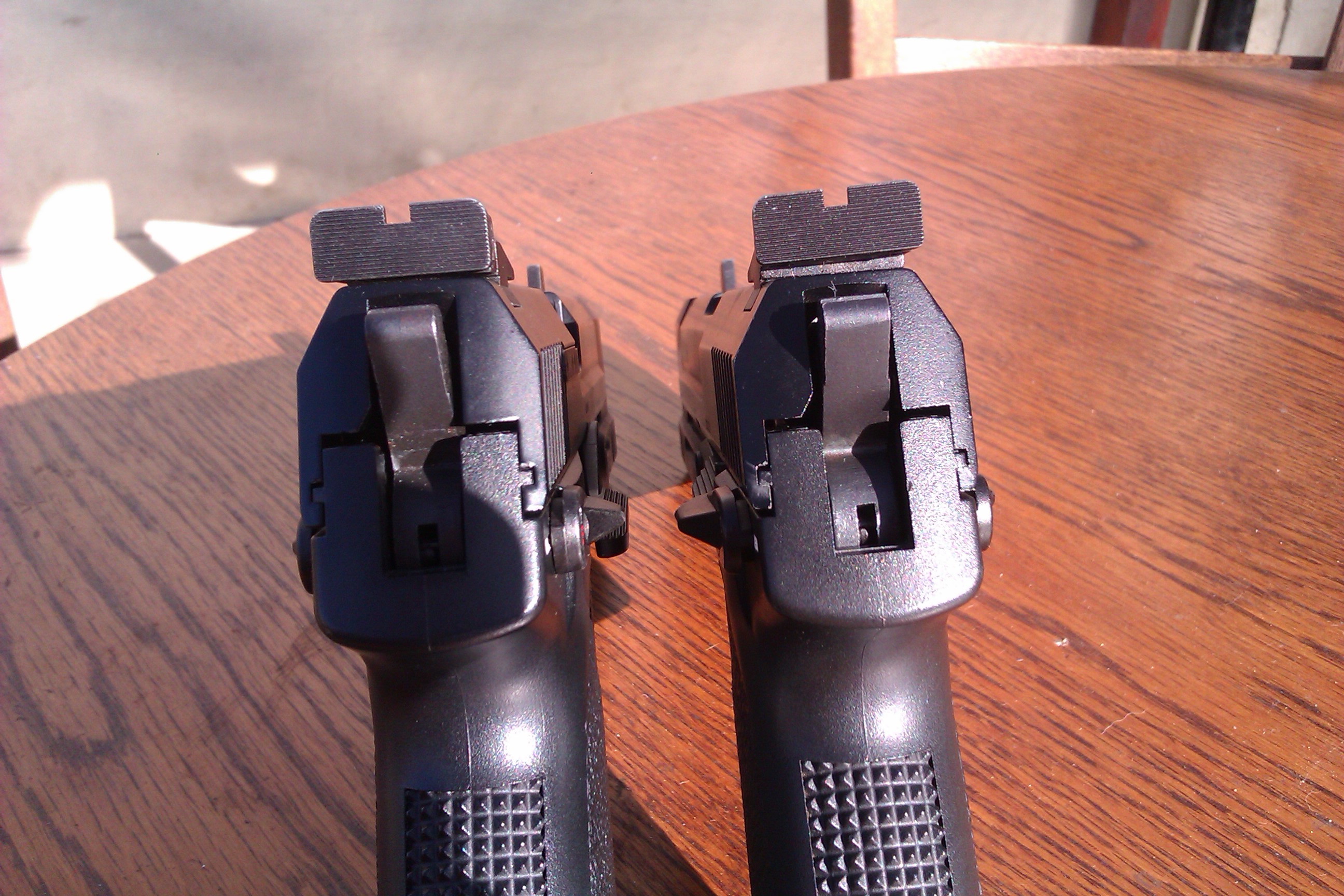 Ako pozerám na obrázku máš tam rovnaké mušky aky mi z Tairom na USP Match riešili sme to výmenou skrutky tá pôvodná je príliž krátka a ak ju uvoľníš vypadne alebo druhá možnosť opilovať prednú mušku Odporúčam tú prvú možnosť