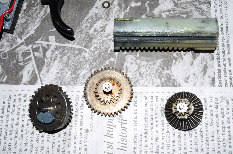 Podle videa, kde funguje semi strelba (kola udelaji cyklus) a faktu, ze je znatelne mene vzduchy pri vystrelu, bych to typoval na sjety pist, v tom případe v pomeru cena/vykon doporucuji SHS, do JG zbrane v zakladu plne dostacuje plastovy se 3 zuby: http://www.armymarket.cz/polykarbonatov ... -shs-d3525pokud chces pist predimenzovat, tak se 7 kovzuby nebo komplet kovovy prebinek: http://www.armymarket.cz/polykarbonatov ... oter-d3667http://www.armymarket.cz/polykarbonatov ... oter-d3668Ale pred nákupem dílu nejdříve rozeber mechabox a zjisti pravou příčinu závady. PS: pokud jsi nikdy nerozdelaval AEG mechabox, doporucuji to prenechat zkušenejšimu technikovi, pokud se vsak do toho i tak chces pustit, precti si následující článek o servisu AEG: http://www.airsoftchrudim.cz/recenze/servis_zbrani.html