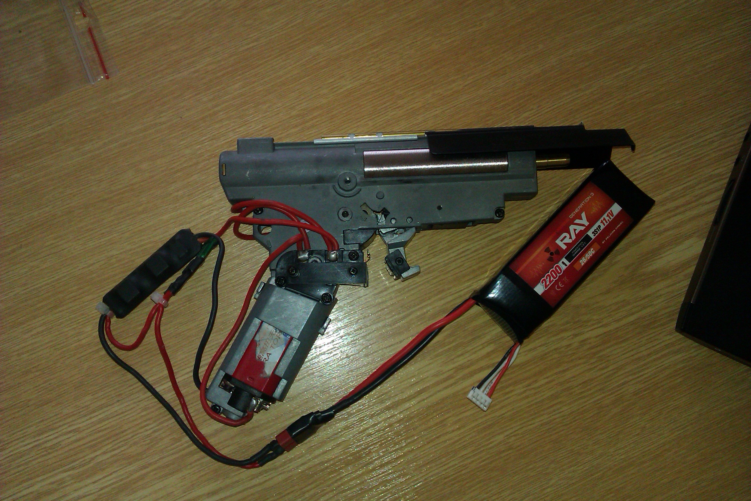 Bohuzel na naprosto myslnou predstavu, jak to elektricky funguje v augovi. na fotce jsem oznacil, jake kontakty slouzi pro semi a jake pro automatickou strelbu. tebou oznacovana divna plastova vec je klasicky spoustovy domek z mechu v 2 - http://www.jefftron.cz/Prislusenstvi/Sp ... x-v-3.html , tj. kdyz zmacknes spoust cca na 1/2 chodu tak se skrz ne sepne spoust a mech vystreli semi (raminko prerusovace vyhodi kontakty) pokud spoust zmacknes az nadoraz, tak specialni mechanismus ve spousti nedovoli jet clunku na semi kontaktech az dozadu a sepnou se oba kontakty v auto kontaktech a zbran strili tak dlouho, jak drzis spoust. imho nejaky vychlylovani auto kontaktu ti je k nicemu, musis spojit oba plisky na tele mechu, aby to jelo, spojeni pouze jednoho z nich nic neudela. Takze rozeber mech a zamer se na funkcnost semi kontaktu