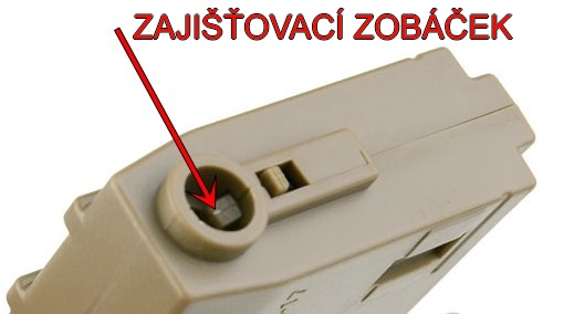 U některých zásobníků, totiž, ho může záchyt držet trochu níž, tím se ústí zásobníku málo vsune do hop komory, proto se málo zatlačí ten zajišťovací zobáček a pořád (částečně) brání kuličkám v cestě.