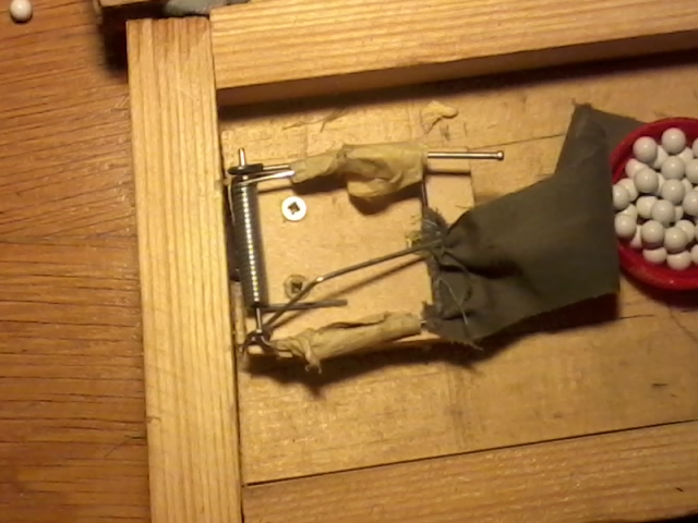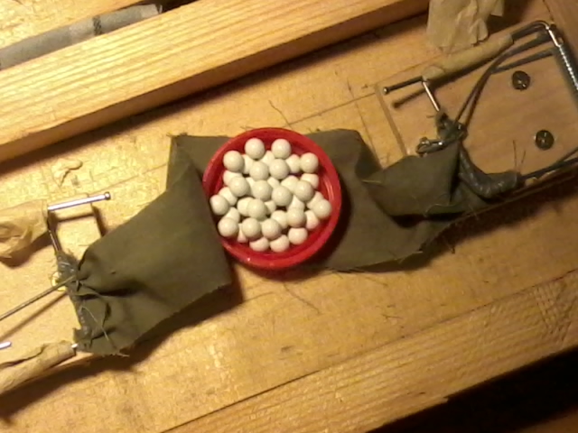 Jako první si sestavíme krabičku, která bude obal miny. Vezmeme prkno a uřízneme ho přibližně na délku dvou pastiček na myši( je lepsi si nechat par cm jako rezervu).Prostor v krabičce má být přibližně stejně vysoký jako je natažená pastička. poté pastičku přeřízneme na polovinu a necháme si tu s pružinou. Ty připevníme na dno krabičky tak, aby v nenatažené pozici koukal drát (který normálně zabijí myš) ven.K drátu přišijeme látku tak, aby byla napnutá když jsou dráty přesně v polovině úderu. Doprostřed látky připevníme malou nádobku, kterou naplníme kuličkami, hráškem nebo prostě tím, co je poruce. spouštěcí mechanismus vyrobím pomocí silného drátu ohnutého do tvaru u. ten vsadíme do dvou vyvrtaných děr, jedné ve poklopu a druhé ve sťeně krabice. pak jen přidáme náplň kuliček a natáhneme pastičky. nádobku uzavřeme a od zavíracího drátu navedeme provaz