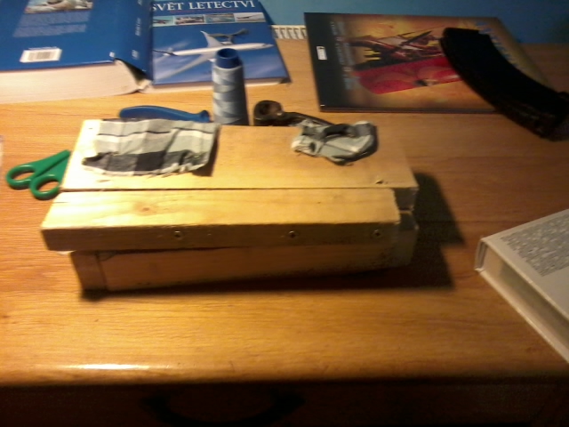 co je potřeba: nějaká prkna o zvolených rozměrech, 2 pastičky na myši(lepší jsou větší), hřebíky, vruty, jehla, nit, panty (dají se nahradit látkou přidělanou místo nich)