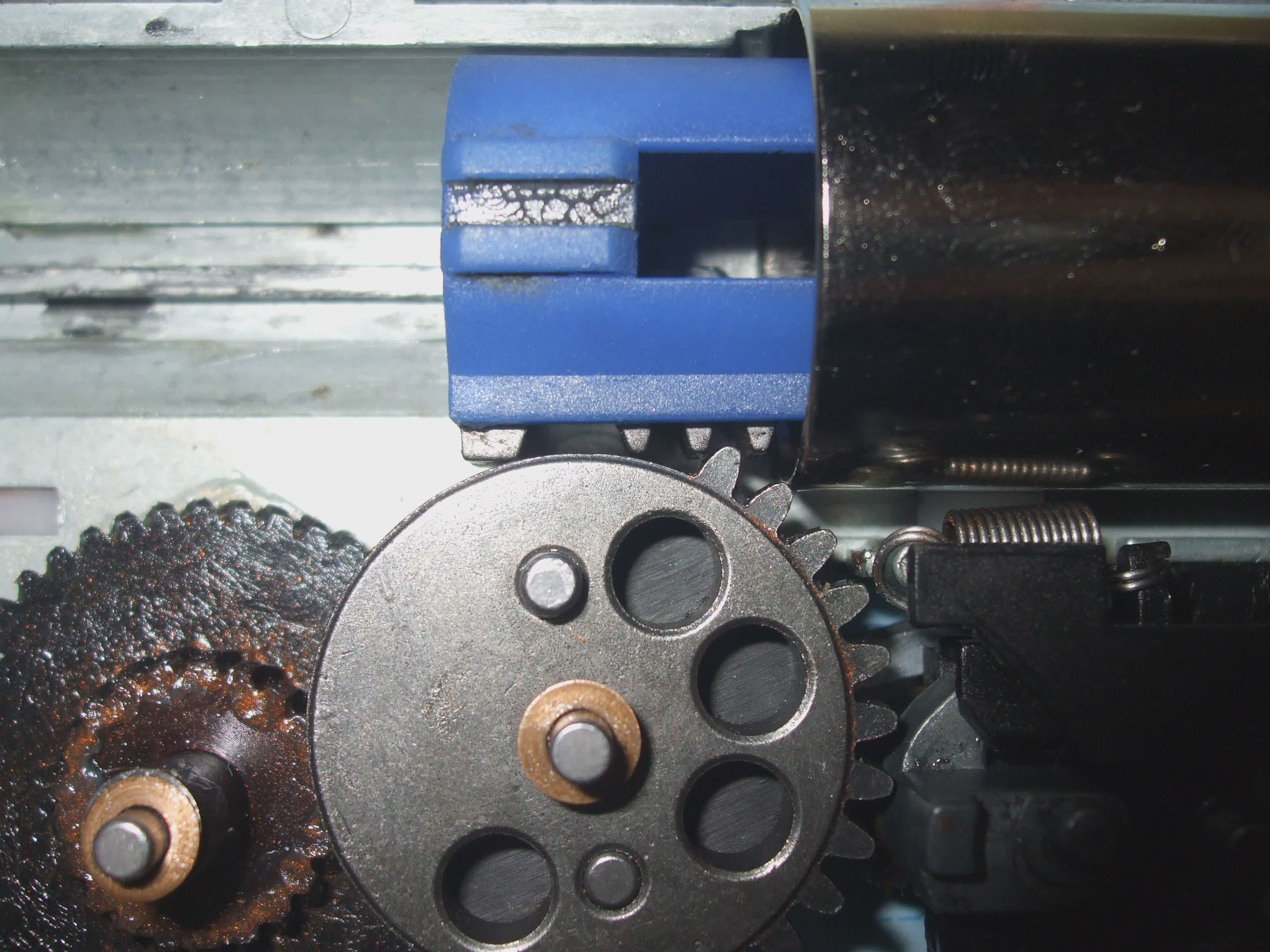Jo mel jsem stejny problem s tim ze jsem na to prisel uz pri vymene dilu a naslednemu testovani na sucho pri skladani mechaboxu, jake presne dily jsem mel si uz nepamatuji, ale zbran SRC M4 III.gen, pist celokovzub myslim aimtop(mozna SHS uz nevim) a kola 100:300 bud UFC nebo SHS, ale je to to same. Kazdopadne jsem zbrousil na kotoucove brusce prvni zub a i lehce ty ostatni tak aby nedrhli o pistove kolo kdyz ho vypusti, dotedka to jede jak ma co vim