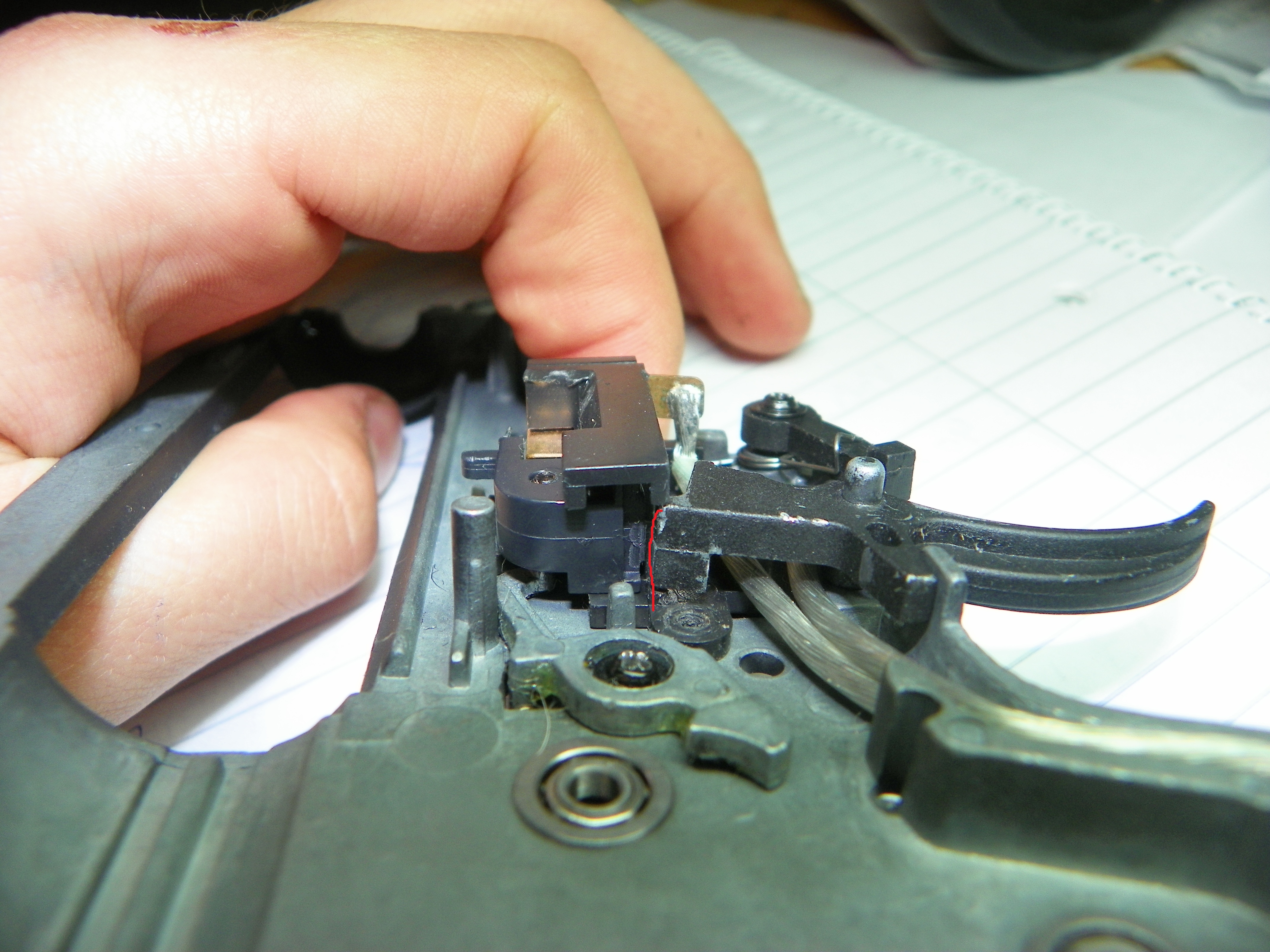 Zdravim, mám menší problém se spouští, která nedosáhne k jezdci, je tam díra cca. 5mm. Mechabox mam od AIMTOPU, poté další problém s ozubenými koli, který se ani nepohnou, mam tušení, že je málo místa mezi koli, přerušovačem střelby a spoušťákem + ta tyčka na který je pružinka k jezdci. \Nevíte co s tim ? Díky.
