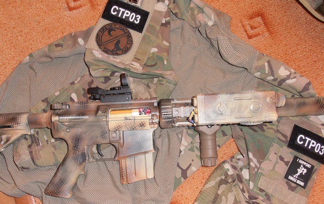 Další moje kuličkovka je M16A3 R.A.S. od ICS přestavěná na SPR. Důvodem k přestavbě bylo, že jsem chtěl SPRko, ale po předchozí kladné zkušenosti s M4A1 od ICS a jejím děleným mechaboxem jsem už nechtěl zbraň řady M16/M4 od jiné značky. ICS však přímo SPR nedělá a já měl doma už delší dobu AEG vnější hlaveň z SPR od G&P, tak jsem se rozhodl jako základ koupit M16A3 R.A.S. a přestavět ji na SPR. Ve zbrani je nerez 6,03 vnitřní hlaveň, kovová hop-up komora ICS, ocelový trn a lepší vzduchotechnika s pružinou M130, se kterou má výkon 145 m/s s 0,20 g kuličkou. http://airsoftshop.cz/product_info.php/products_id/8912