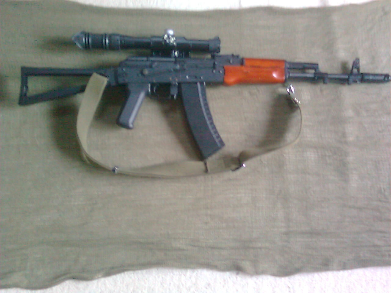 Chjo, další, co do AK-74 cpe zásobník z AK-47 . . . Kurňa chlapi to nevidíte, že se ty zásobníky liší zahnutím, kvůli rozdílnému střelivu ráží 5.45 / 7.62 ? Stará 74-ka se dřevem má mít méně zahnutý hnědočervený plasťák z polymeru. Jinak pěkný ''dřívko z Afghánu''.