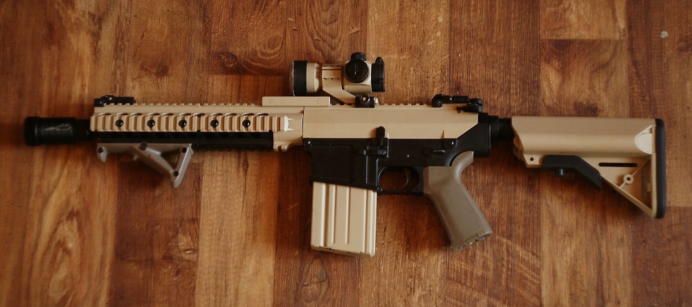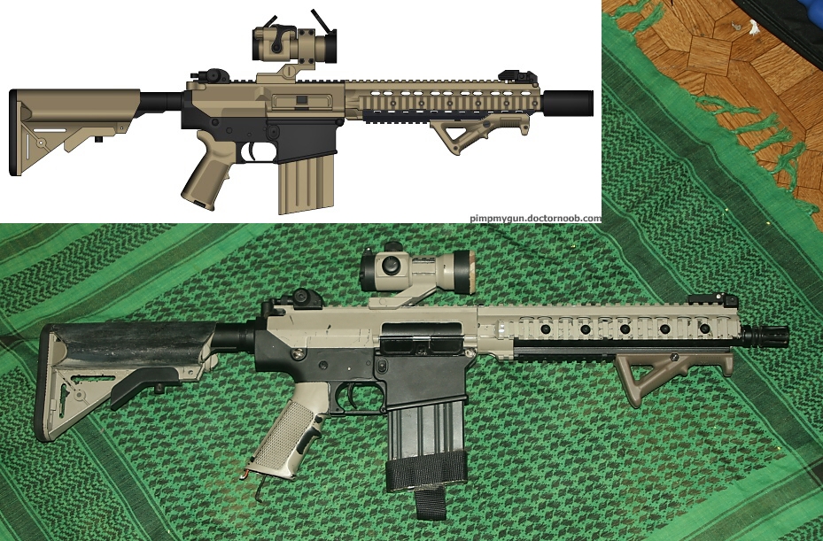 Ta barva mi přijde nějak světlá, to je Krylon?? Ještě by mohlo AFG a pažbička ladit se zbytkem kvéru...jinak ten koncept je pěknej, ten aimpoint tomu sluší...