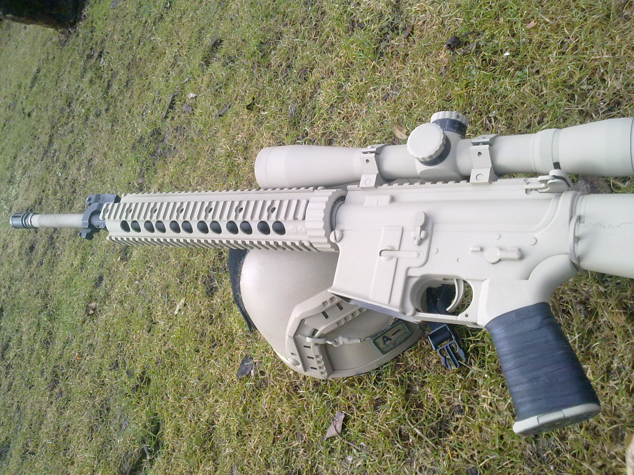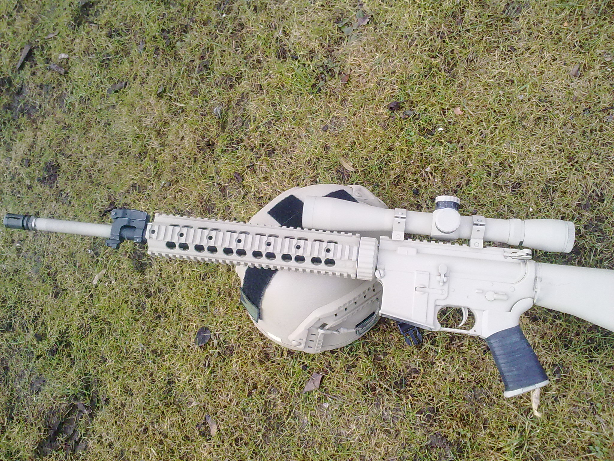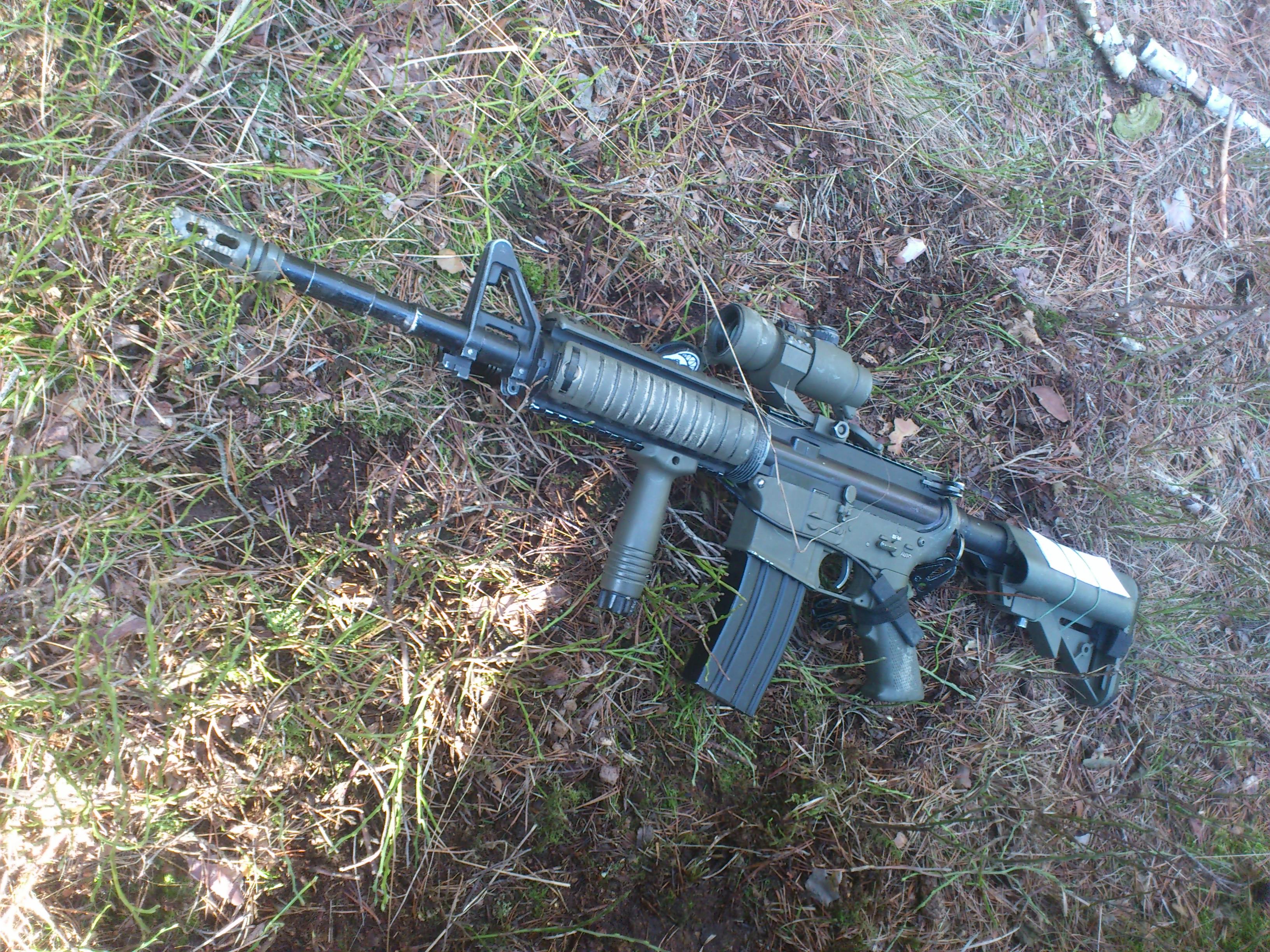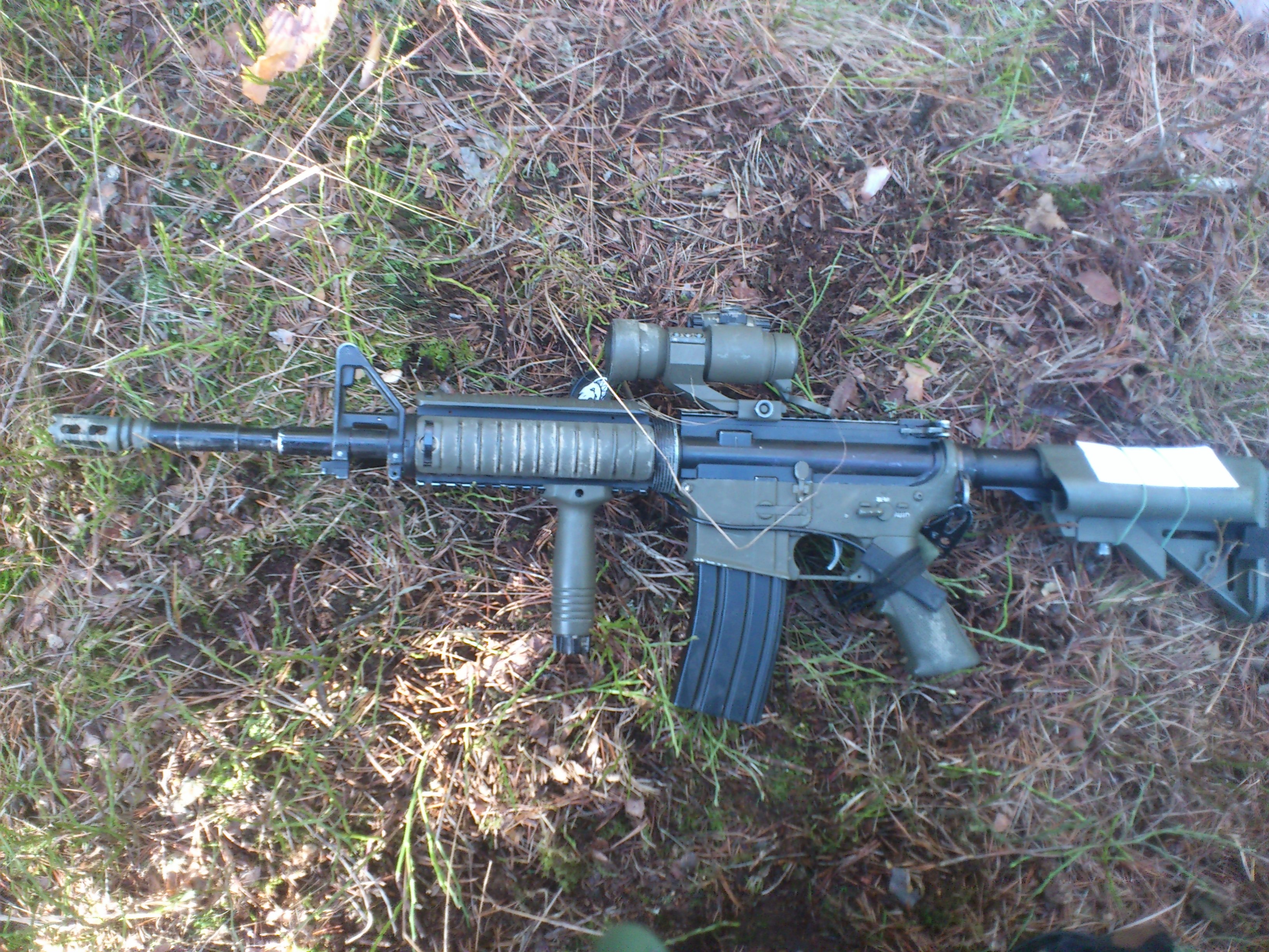 Takže, kupoval jsem tenhle: http://army-shop.cz/produkty/kamuflazni ... /6774.html sprej v barvě olive drab. Stříkal jsem tím M4 (spodní část těla+doplňky) a helmu. Helmu bohužel nafocenou nemám, původně byla coyotová, teď je o něco tmavší než ta M4. Se sprejem se mi pracovalo dobře a na vše stačila jedna vrstva, akorát helma měla nějaký světlý místa tak ty jsme ještě při zasychání vzal podruhý. Jinak vůbec nelituju a neměnil bych za jinej, barva maskuje v lese naprosto parádně, má pěknej, matnej a na úchop příjemnej povrch. BTW: Stříkáte to bezbarvým lakem? Měl jsem to na první akci a ta M4 už má nějaký škrábance, zdá se mi že to proti tomu škrábání má až moc malou odolnost. Příloha: