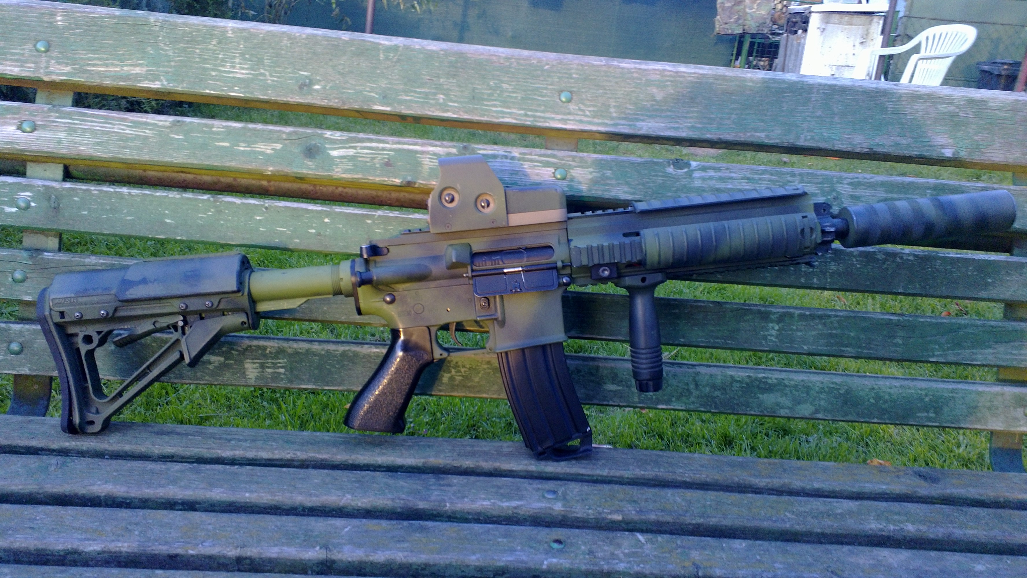 Pro mne je dulezite, aby to maskovalo v prirode a rozbilo siluetu zbrane a tahle kombinace maskuje docela dobre. Na tech fotkach s betonem to samozrejme neni patrne. V minulosti jsem vytvoril jednu na pohled hezkou omalovanku, ale pri akcich to vubec nemaskovalo
