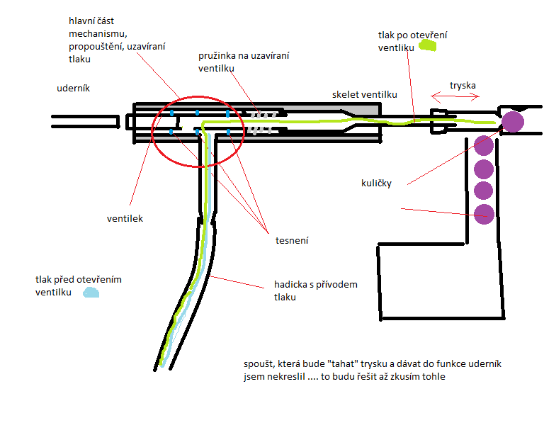 tady přikládám !hodně! stručný a nepřesný nákres jen pro pochopení jak bude tlak procházet až do komory, kterou jsem tam zapomnel dokreslit ale tu si každej domyslí .....