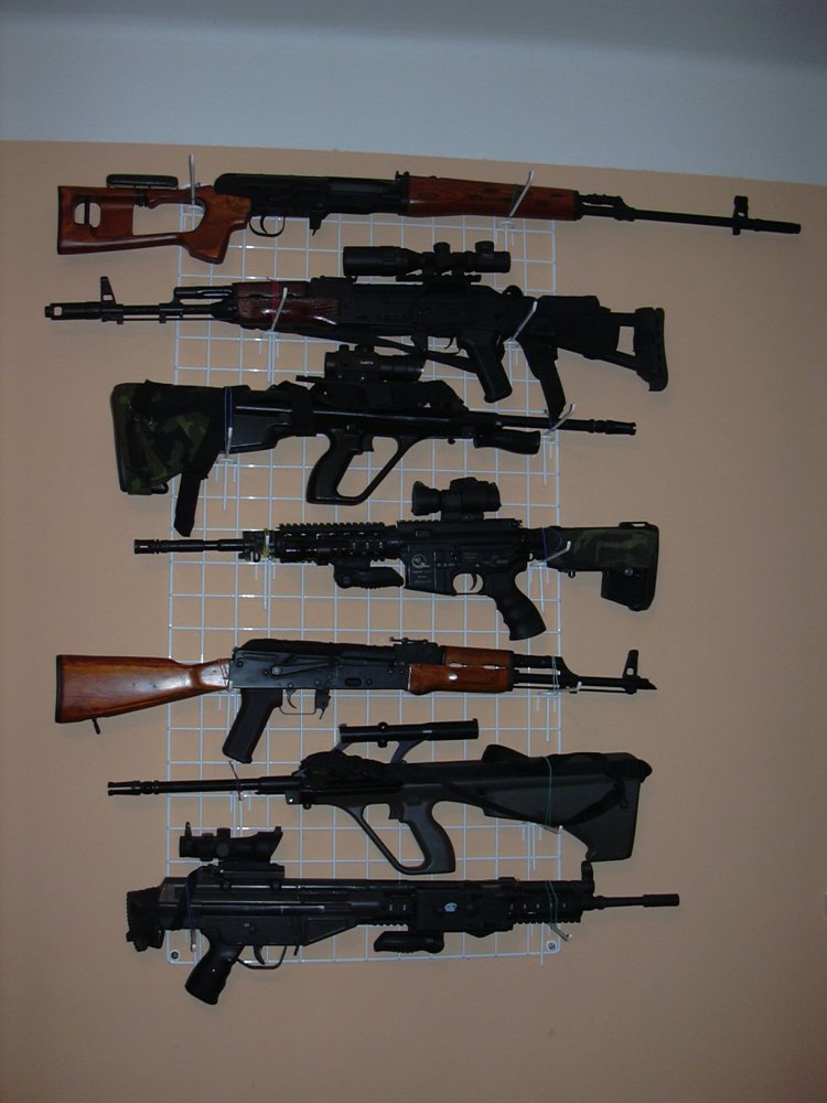 Mohu potvrdit že drátovaná síť a háky jsou nejlepší řešení. Mne to vyšlo na 1222 i s poštovným a 12ti háky na šest zbraní a je to navíc nenápadné narozdíl od dřevěných stojanů