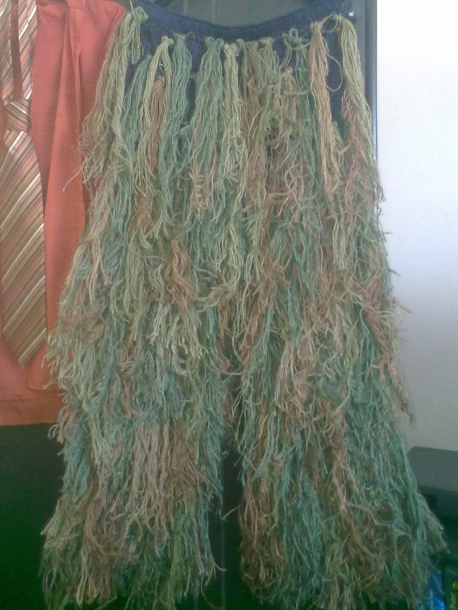 zahradnictví, říde pletaná juta (kupoje se to na metry čtvereční) požívá se to na obalovaní stromů a podobné strandy. běžně se to dá sehnat v béžové, zelené a hnědé, pak dobarvit duhama a šlupkama z cibulí ap odobnýmasrandama na několik etap pro několi barev.... pochopitelně rovnou koupit střapce usnadní práci... a nebo to udělat z trhaných jutových pásků a ono se to na vlákna roztřepí samo během pár proplazení ostružinama a zdravým pobytem na venkovním dešti