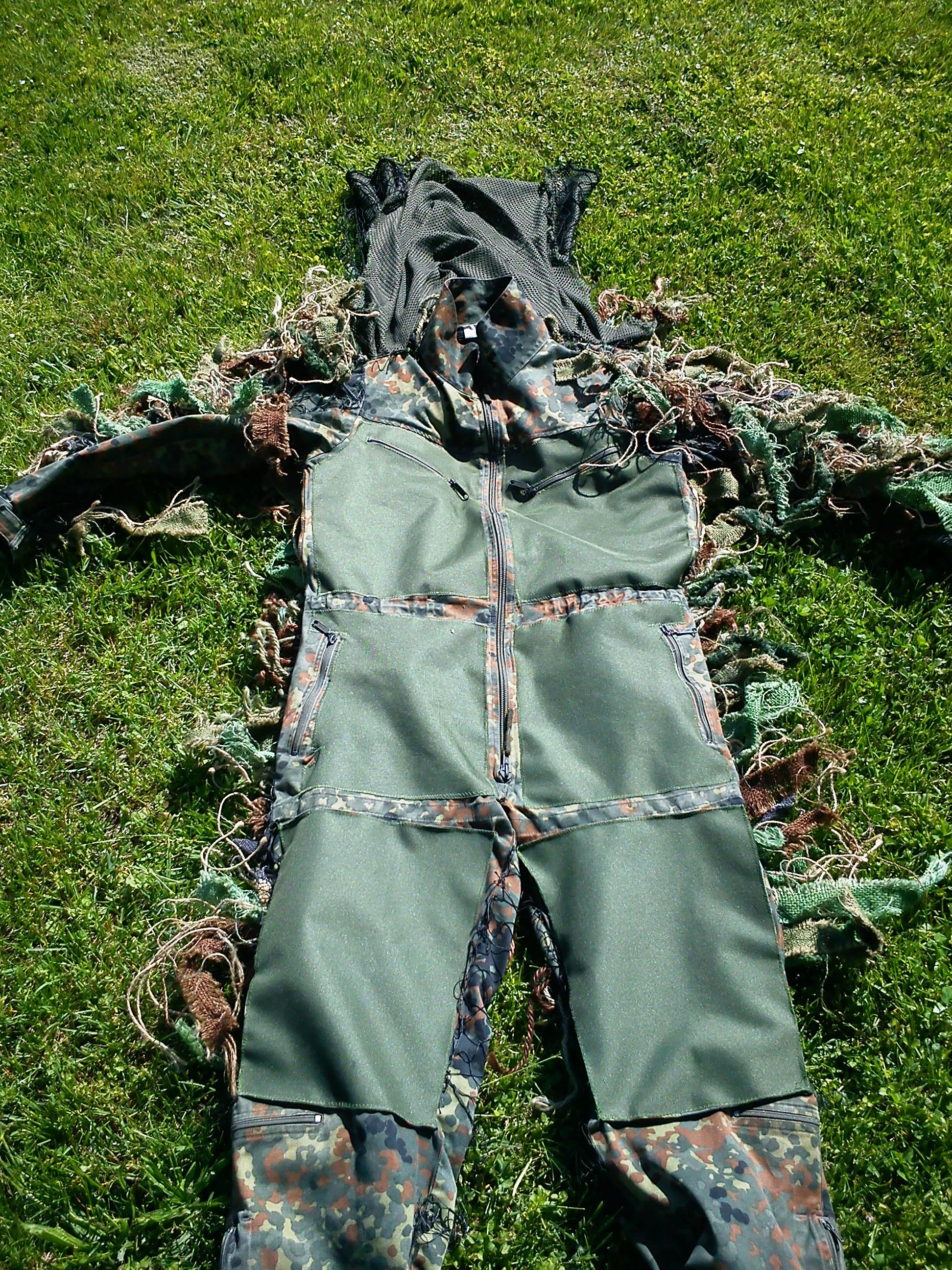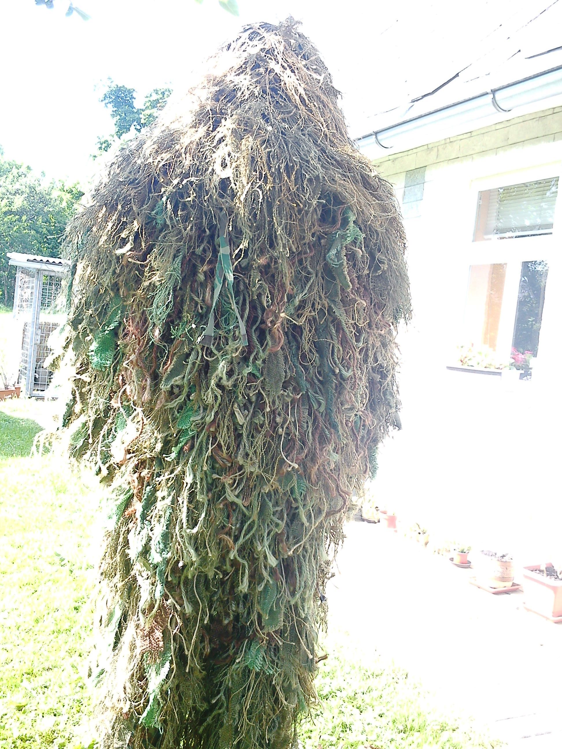 moje dnešní prdění se s úpravami  výsledkem jsou: -odvětraný záda + boky na zip -na přední straně našitá nepromokavá látka a odolná proti oděru ( ještě to asi -stříknu sprejem aby nebyla jednolitá zelená ) -nová pokrývka hlavy na bázi kapuce,která je napevno přidělaná k ramenům a střed je volný takže,celá "kapuce" jde přehodit dopředu  např když ležíte a potřebujete dodělat "vegetaci" -ted uz zbýva jen dodělat nohy a namotávat