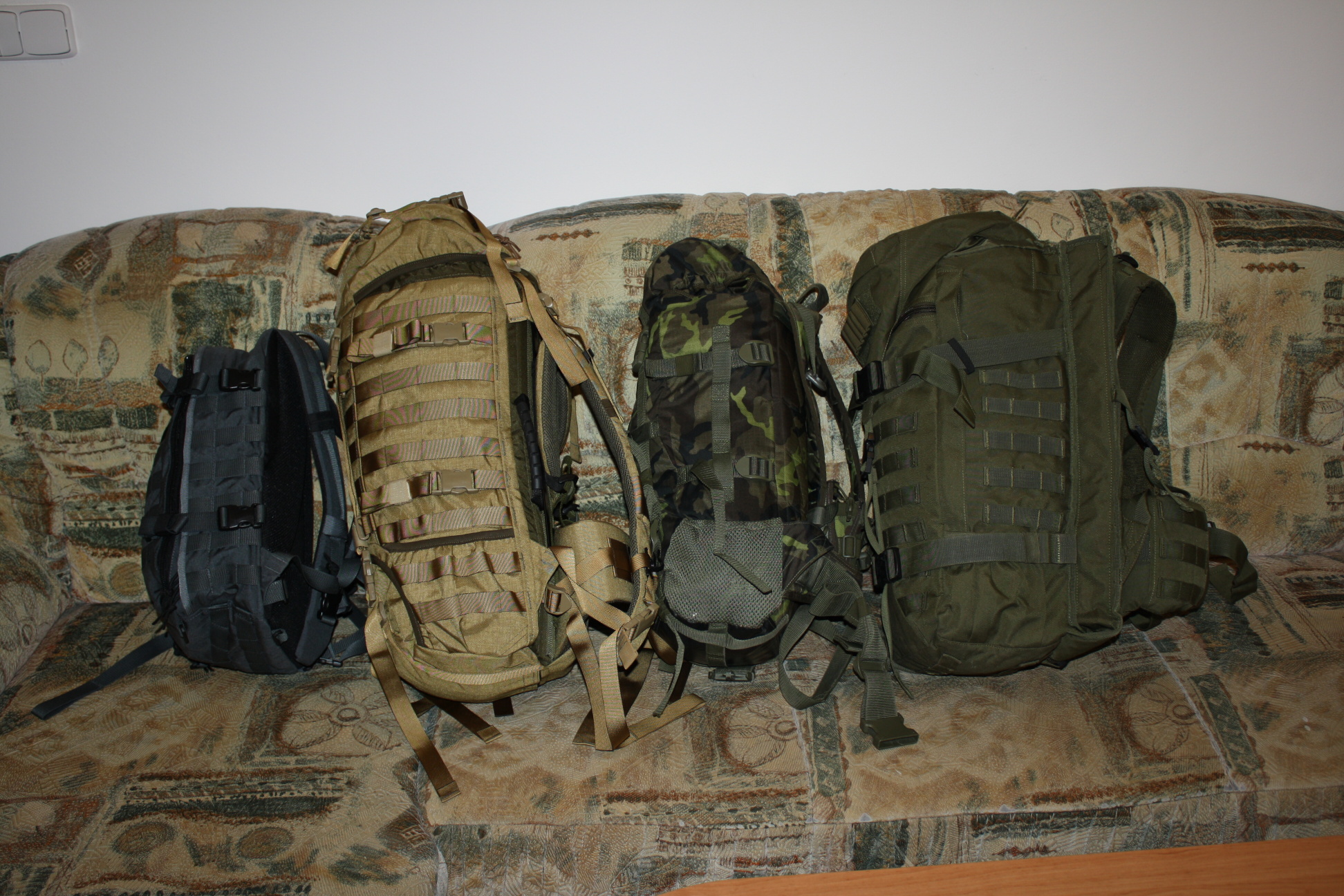 no takze Tactical Pro batohy jsou doma. Kupoval jsem teda Tactical 20 II v šedé barvě a Tactical 45 II v Coyotu. Ta 20ka mě mile překvapila. prostorný dobře řešený batoh. Nošení na zádech zatím pohodlné. 45ka od pohledu taky super. Trochu se bojím těch "posuvných" zad a trochu mě štve obrovské množství popruhů které přečnívají (i s těma killerama popruhů je jich pořád dost). Nicméně jsou dobře umístěné, takže nabalit okolo batohu hromady dalších věcí nebude problém. Z fotek na tacticalpro.cz mi ta 45ka přišla "stejná" jako asi nejrozšířejnější bágl a to SPM20ka. ovšem na živo vedle sebe je opravdu ta 45ka 2x větší. Matroš je na obou batozích festovní, pohodlné jsou záda, popruhy i bederák. Oba batohy mají kapsy a vývody na camelbag. Na nějaké obecné objektivní hodnocení je brzo, ale co se týče materiálu a zpracování tak tacticalpro mi připadne mnohem dál než SPM. V příloze dávám dvě fotky - srovnání 4 batohů. Zleva 1) Tactical Pro 20 II 2) Tactical Pro 45 II 3) SPM 20 4) Kopie Eberle Gunslingerpack ps: zajímavé je, že SPM udává u svého batohu objem 20 litrů, stejně tak jako Tactical Pro u Tactical 20ky