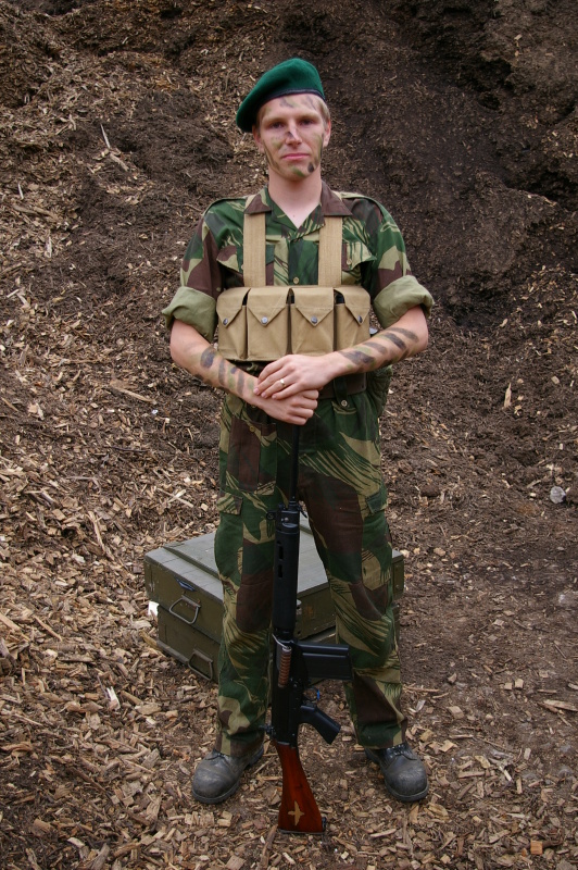 Před časem jsem tu na fóru poptával maskáče na Rhodesii. Nakonec jsem si musel pomoci sám. Po děsivé dražbě na jihoafrické obdobě ebay sem si uzmul za těžký peníz jedny origo kalhoty a origo blůzu jako ulité na mě. K tomu dokoupil jeden britský opasek a dvě klasické us čutory a hle, rhodesijský voják ve stylu selous scout je na světě  Na začátek dobré, ale až mi dorazí i maskovaná repro čepice a originální výstroj, bude to lepší.