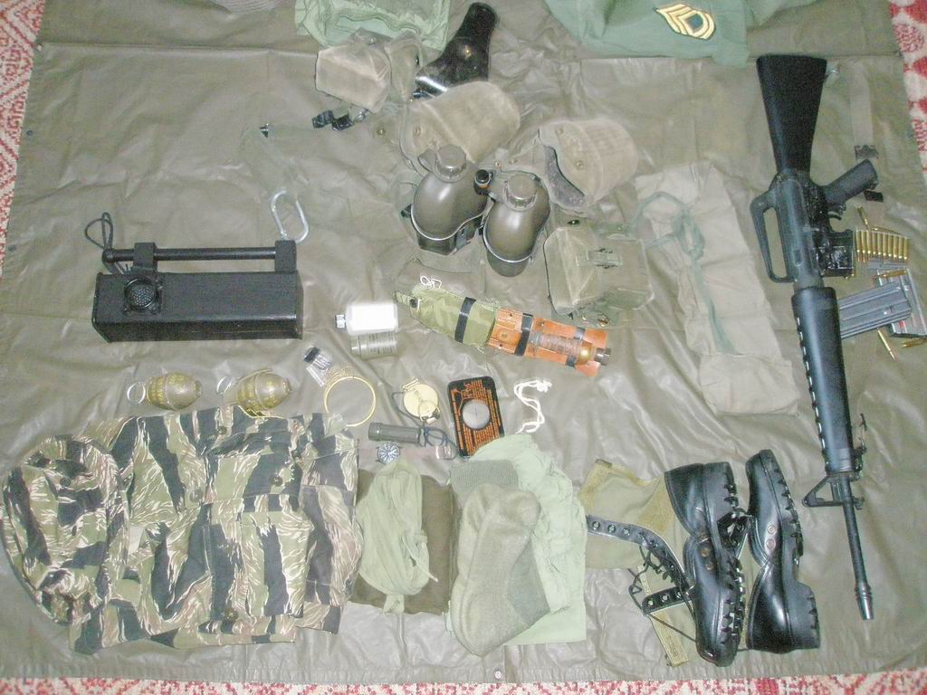 CIDG batoh, M159 fléra, M18 žlutej kouř, karabina a pracovní rukavice obsah batohu: černej vršek VC pyžama, OD triko náhradní, nylon sleeping shirt, ERDL poncho liner, HW poncho, náhradní ponožky, náhradní boxerky, MX-991/U baterka, trioxane, kus špagátu, 1QT lahev, ještě tahám c-rations ale došly na základně, vycházce: baret, piloťáky AO, tropická uniforma 3.model, nějaký ty legrační peníze (MPC), dolary, máčka, sirky, tranzistorák CROWN