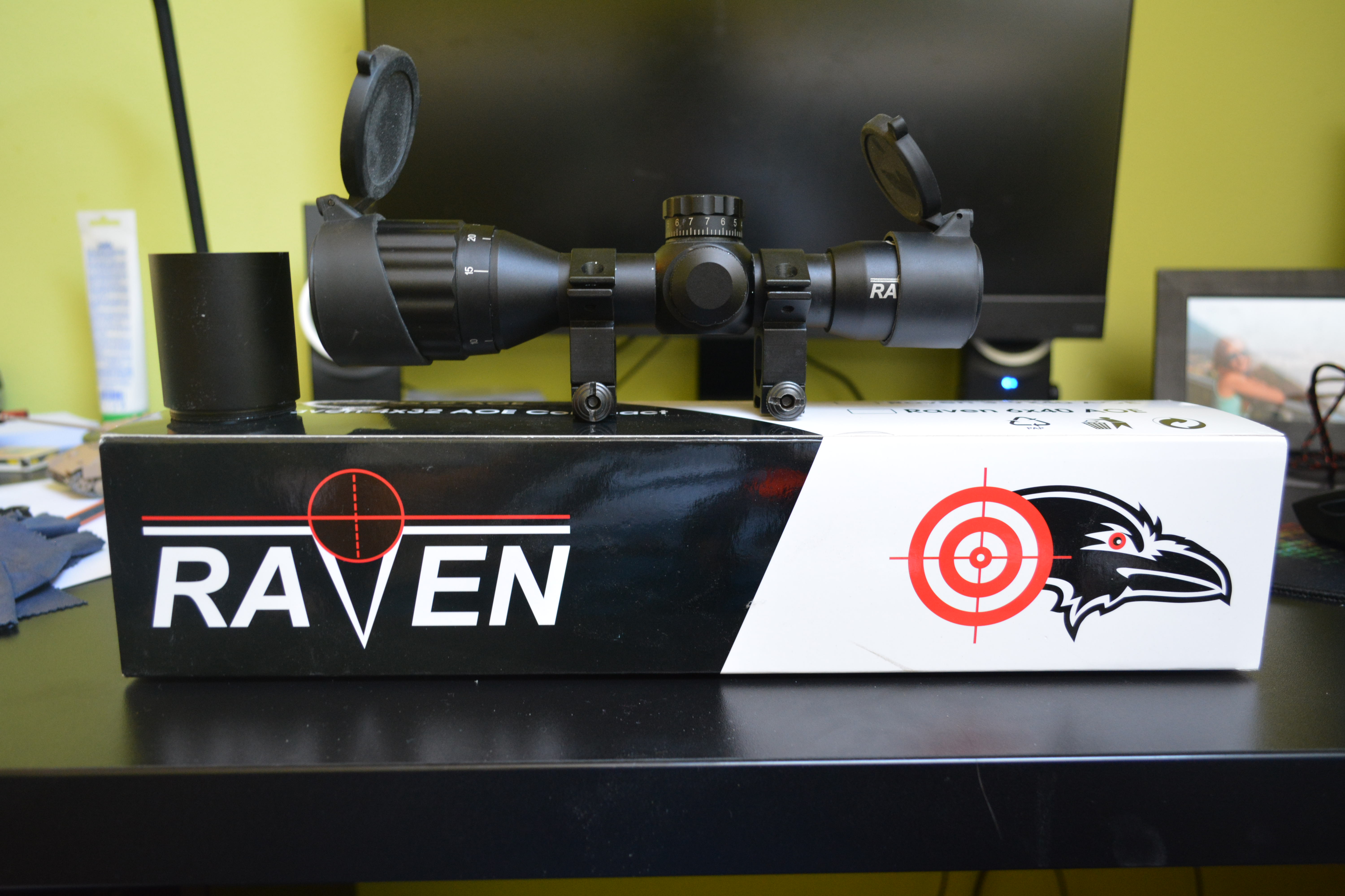 Zdravím, prodám tento puškohled značky RAVEN, kupován 2015, už bez záruky, používán minimálně, většinu času ležel ladem. Součástí balení je sluneční clona, i gumové krytky.