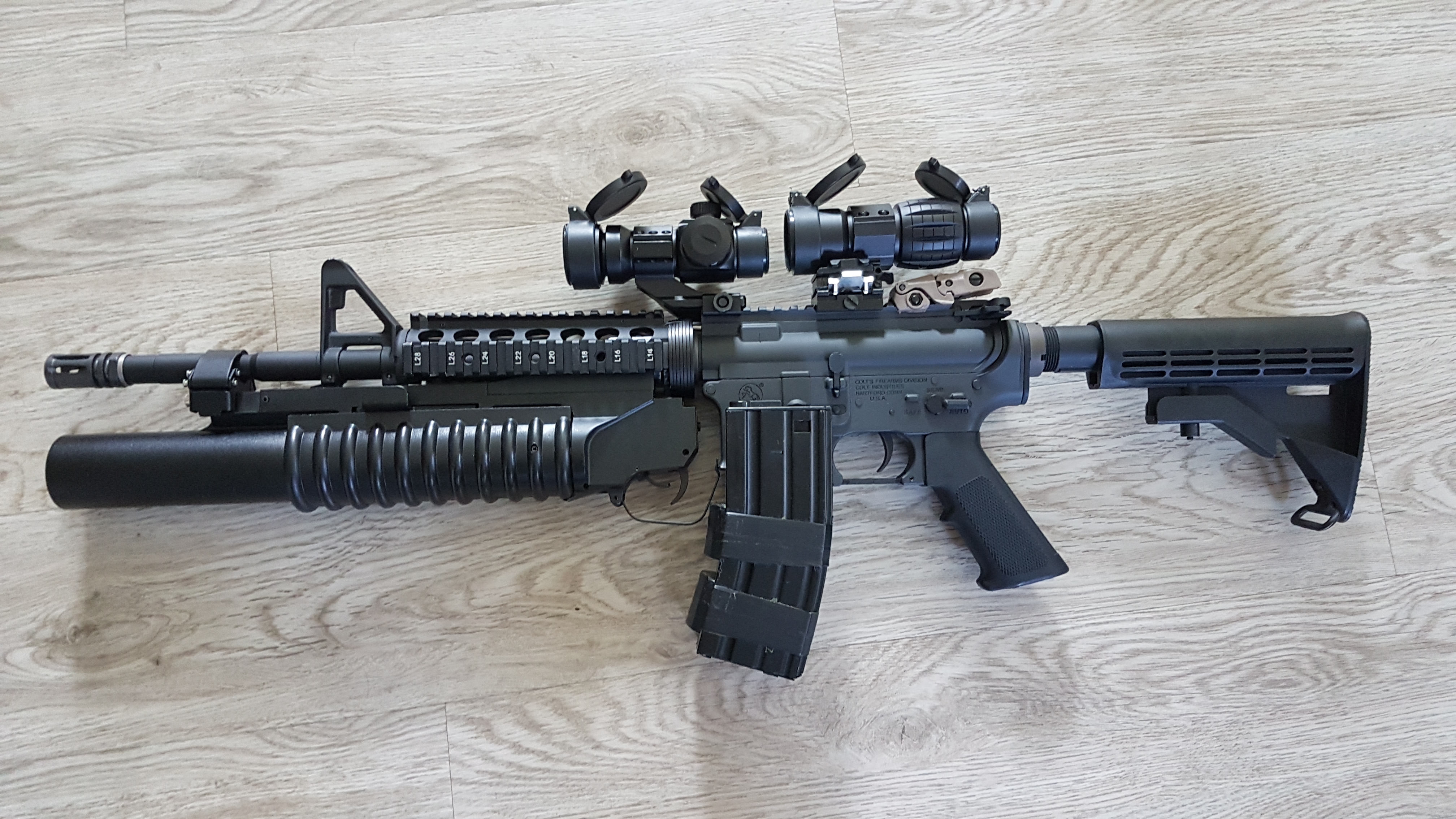 Prodám elektriku M4 RAS od firmy G&P. Velice zachovalá bez škrábanců, téměř nehraná (2-3) akce. Měl jsem ji spíš do sbírky :) K tomu je granátomet M203 long type od firmy D-Boy pro plynové granáty, včetně granátu od firmy Classic Army na asi 160bb. Ke zbrani je dále úplně nová sklopná optika s kolimátorem (red/green dot) a sklopná mířidla. Dále zbytek kuliček, 3-bodový popruh a li-pol baterie včetně ochranného obalu. Zbraň je po upgradu pružiny 130 a přesnější hlaveň 6.04mm. Přidám ještě nenamontovaný upgrade hop-up komory a nějaké díly a mazání. To vše za 9000Kč.