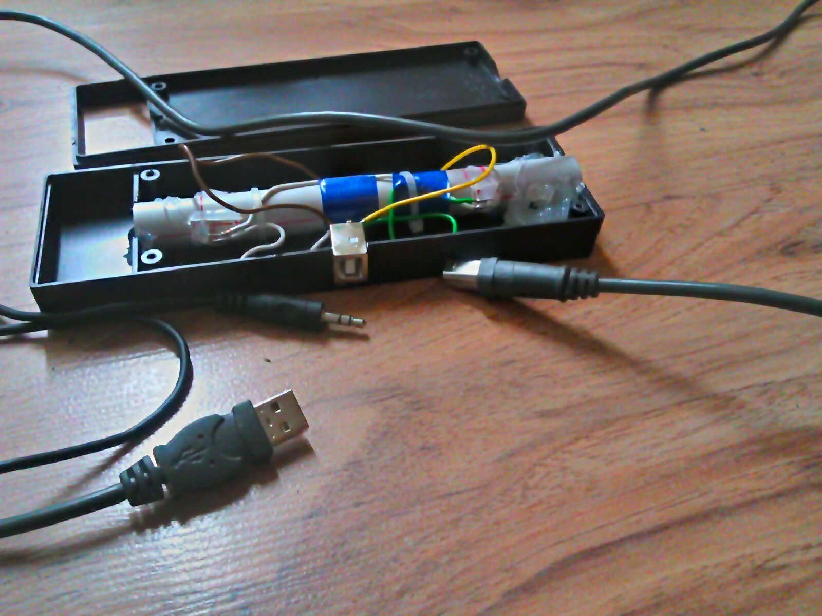 Uplně první schéma obsahující 5 součástek. Akorát jsem to strčil do krabičky od ovladače a doplnil USB zásuvkou. USB kabel se na jednom konci strči do mé krabičky a na druhém konci do USB. Ještě je tam odbočka na jack do zástrčky pro mikrofon.