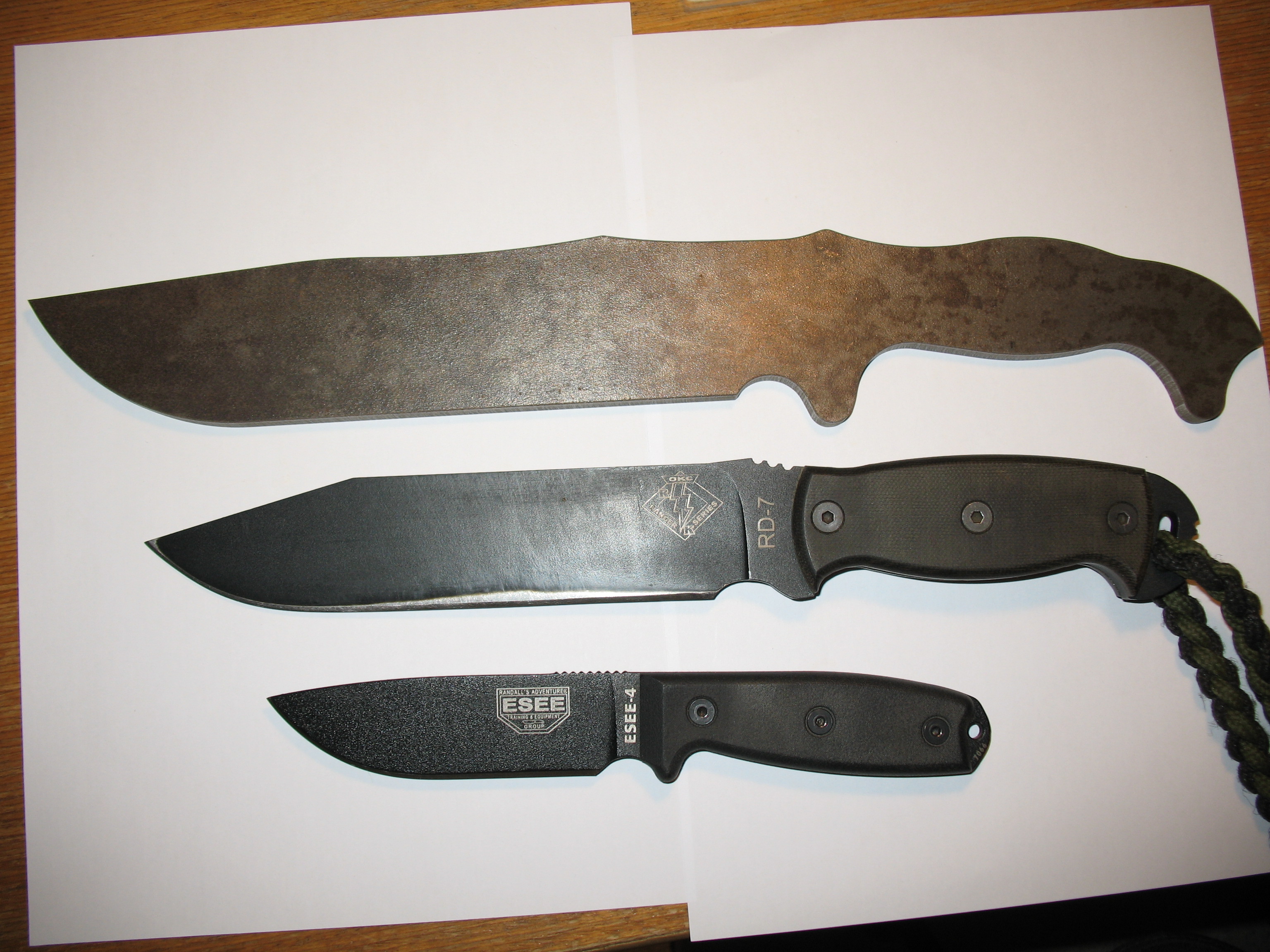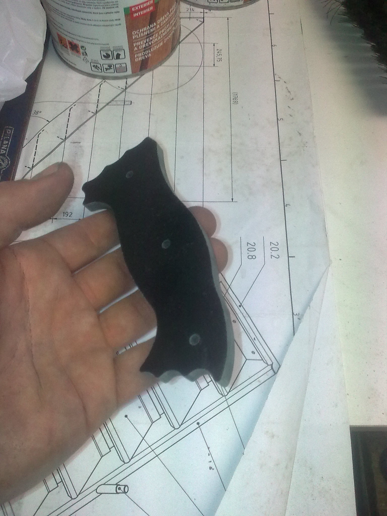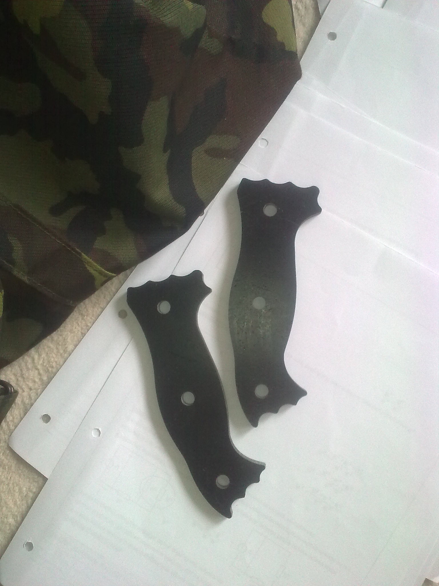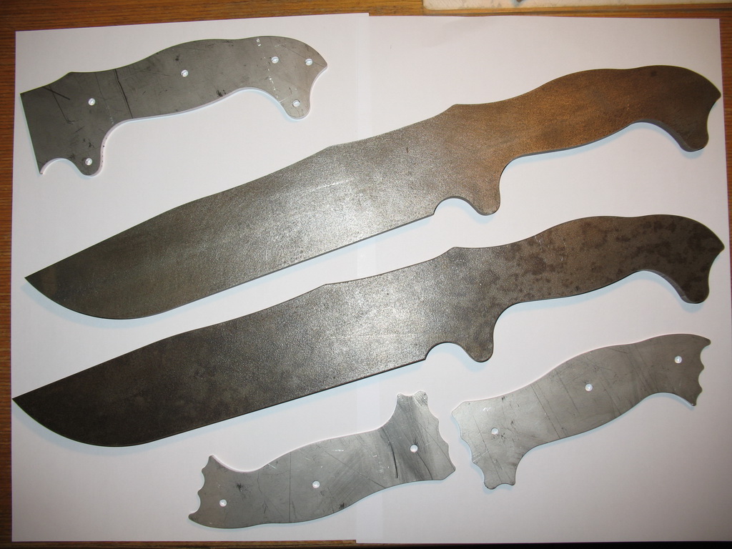 to tomcat: Blackovo Bolo rozhodně respect Trochu to tu oživím, před nějaku dobou jsem se zamiloval do nože , který se už nevyrábí a jeho cena se na ebay pohybuje okolo 700 dolarů......jedná se o naprosto ultimátní bojový pracovní nůž Battle Mistress vyrobený společností Busse. Originál je z legendární ocele INFI patentované zmíněnu společností, délka je 40,5cm a síla čepele u některých modelů až 0,32 palcem, tedy 8,128mm!!!! pár fotek http://www.bladeforums.com/forums/showt ... e-Mistress http://rathy.rajce.idnes.cz/Busse/Kvůli astronomické ceně a nedostupnosti jsem se rozhodnul, že si ho nějak vykouzlím, za co nejméně peněz. Dal jsem se teda do shánění a na serveru knife.cz jsem sehnal výkres v autocadu....samotného nože i střenek Potom jsme se dal do shánění ocele, požadavek byl jasnej, tlouštka minimálně 7mm, minimální náročnost na opracovnání a kalení a maximální nezničitelnost za co nejmíň peněz....rozhodl jsem se tedy pro jednoduchou a spolehlivou pružinovou ocel. Po spoustě mailech s prodejcema ocelí a údivu nad mnou požadovanou tloušťkou jsem nakonec napsal do pružinárny v Plzni, kde se jim válel plát 150x500x8 a za 5 dní byl doma 5kg vážící plochej balíček za pár stovek  Následovalo řezání, díky rozměrům plátu se nože vešli v klidu dva  , takže plát s výkresem putovaly na vodní řezačku někde u HK.....výsledky jsem dostal k vánocům V současný době se mi doma válí jeden polotovar, druhej je na broušení a kalení u nožíře. O víkendu jsem připravil střenky....už netrpělivě čekám, až dorazí, hotová čepel od nožíře Střenky jsou od začátku do konce home made. Materiál je tzv mikarta, což je vrstvená a pomocí epoxydu slepená a lisovaná látka. Vrstvil jsem černou a tmavě zelenou, uvidíme co po broušení vyleže za strukturu. Je to takovej laminát, tlouk jsem do zbytků kladivem a všeljak je lámal, bežnou sílou je to skoro nezničitelný!!!! Na fotkách jsou polotovary po řezání vodou, porovnání velikosti s nožema co nosím(RD-7 do lesa, ESEE-4 mám POŘÁD u sebe), šablony na střenky řezaný z nerezu laserem a výroba střenek.