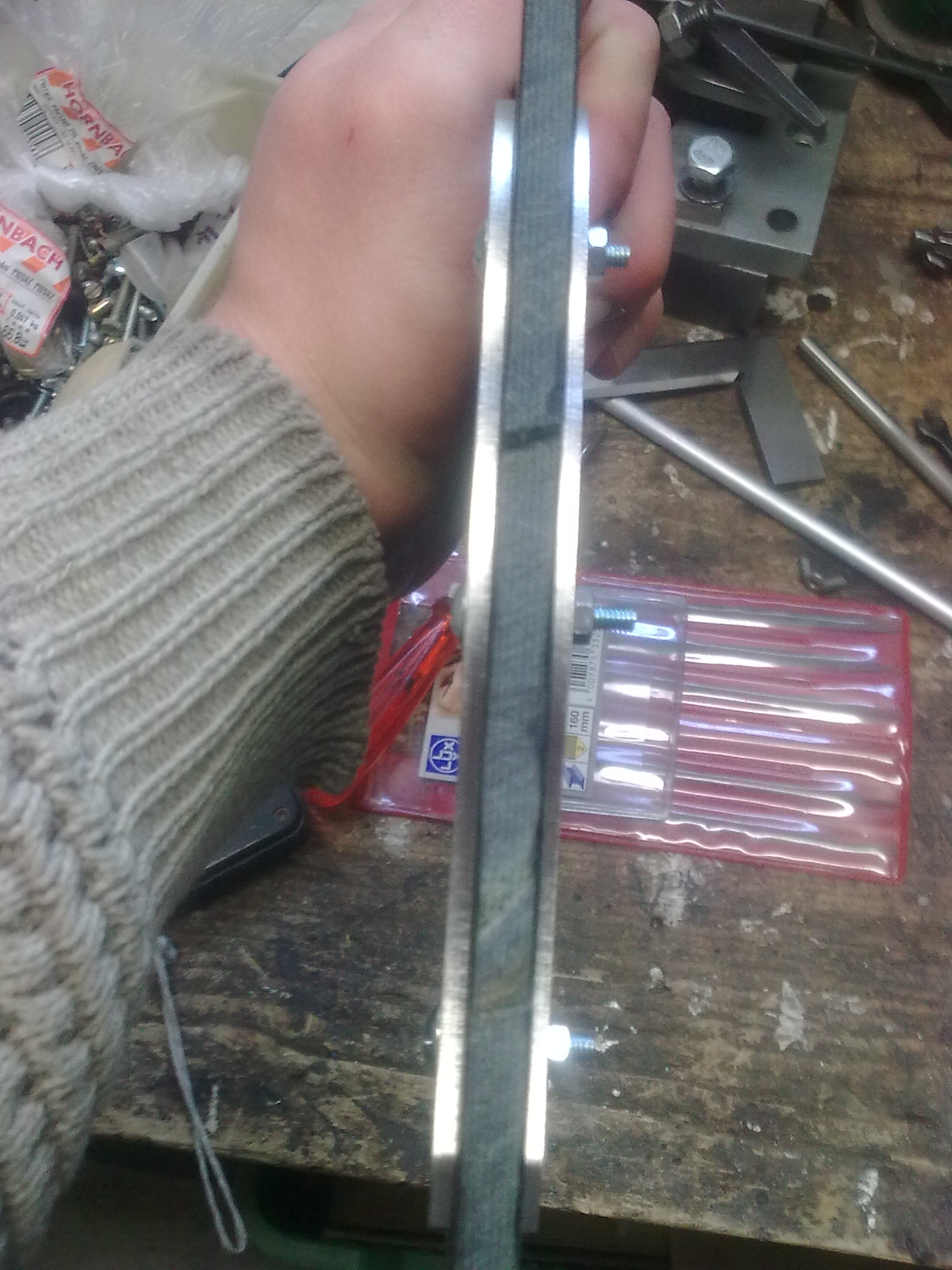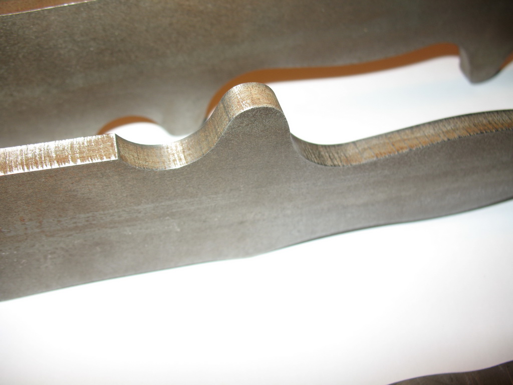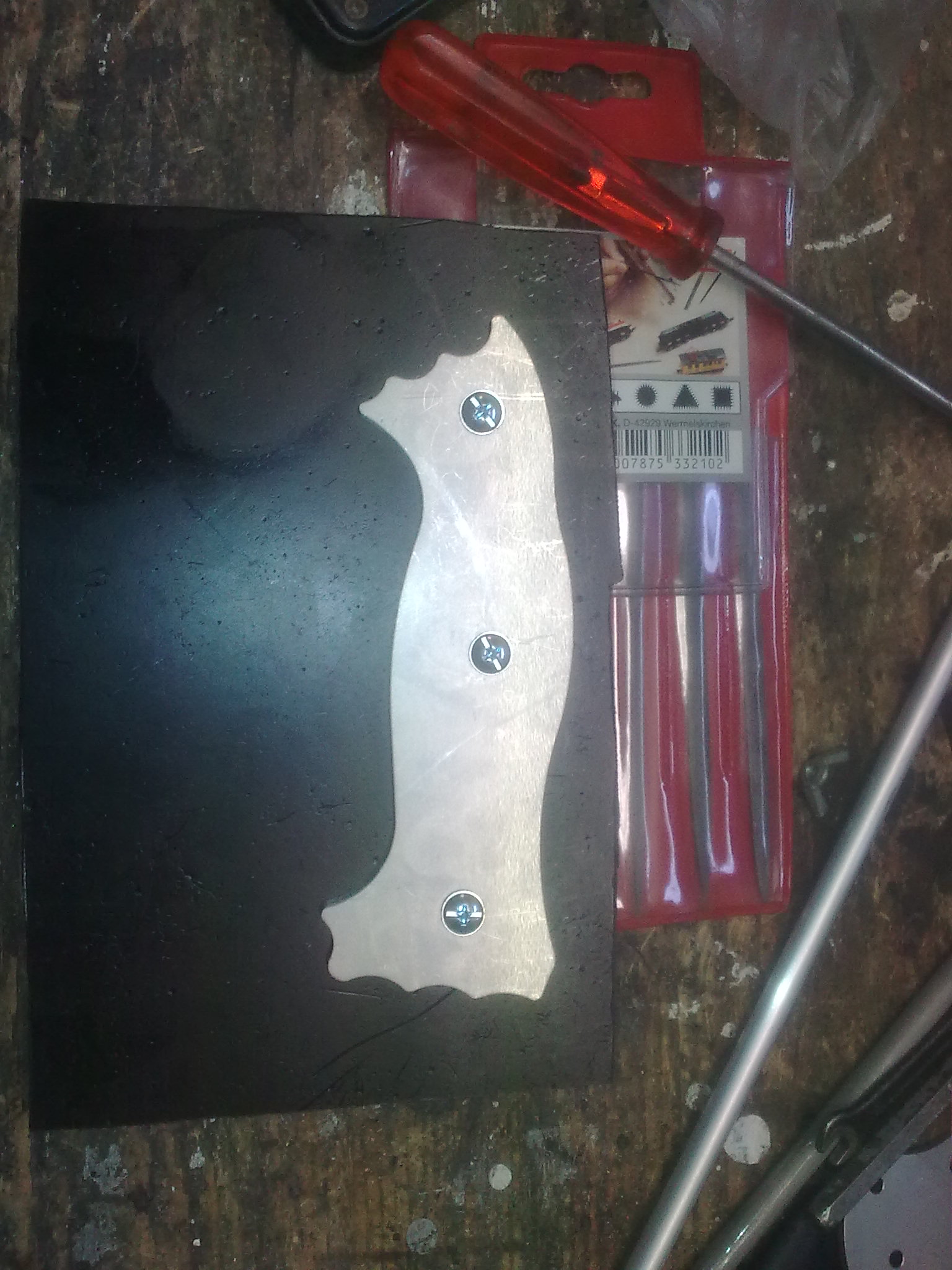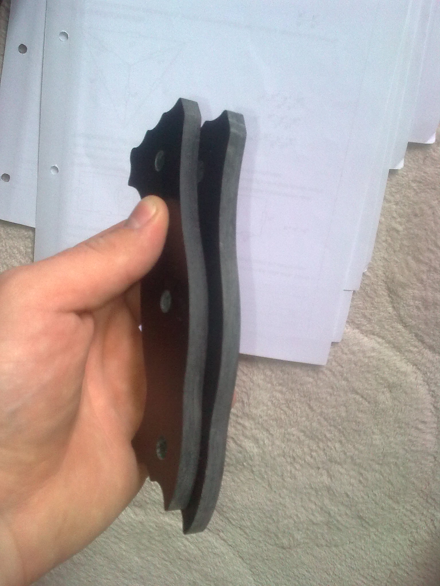 to tomcat: Blackovo Bolo rozhodně respect Trochu to tu oživím, před nějaku dobou jsem se zamiloval do nože , který se už nevyrábí a jeho cena se na ebay pohybuje okolo 700 dolarů......jedná se o naprosto ultimátní bojový pracovní nůž Battle Mistress vyrobený společností Busse. Originál je z legendární ocele INFI patentované zmíněnu společností, délka je 40,5cm a síla čepele u některých modelů až 0,32 palcem, tedy 8,128mm!!!! pár fotek http://www.bladeforums.com/forums/showt ... e-Mistress http://rathy.rajce.idnes.cz/Busse/Kvůli astronomické ceně a nedostupnosti jsem se rozhodnul, že si ho nějak vykouzlím, za co nejméně peněz. Dal jsem se teda do shánění a na serveru knife.cz jsem sehnal výkres v autocadu....samotného nože i střenek Potom jsme se dal do shánění ocele, požadavek byl jasnej, tlouštka minimálně 7mm, minimální náročnost na opracovnání a kalení a maximální nezničitelnost za co nejmíň peněz....rozhodl jsem se tedy pro jednoduchou a spolehlivou pružinovou ocel. Po spoustě mailech s prodejcema ocelí a údivu nad mnou požadovanou tloušťkou jsem nakonec napsal do pružinárny v Plzni, kde se jim válel plát 150x500x8 a za 5 dní byl doma 5kg vážící plochej balíček za pár stovek  Následovalo řezání, díky rozměrům plátu se nože vešli v klidu dva  , takže plát s výkresem putovaly na vodní řezačku někde u HK.....výsledky jsem dostal k vánocům V současný době se mi doma válí jeden polotovar, druhej je na broušení a kalení u nožíře. O víkendu jsem připravil střenky....už netrpělivě čekám, až dorazí, hotová čepel od nožíře Střenky jsou od začátku do konce home made. Materiál je tzv mikarta, což je vrstvená a pomocí epoxydu slepená a lisovaná látka. Vrstvil jsem černou a tmavě zelenou, uvidíme co po broušení vyleže za strukturu. Je to takovej laminát, tlouk jsem do zbytků kladivem a všeljak je lámal, bežnou sílou je to skoro nezničitelný!!!! Na fotkách jsou polotovary po řezání vodou, porovnání velikosti s nožema co nosím(RD-7 do lesa, ESEE-4 mám POŘÁD u sebe), šablony na střenky řezaný z nerezu laserem a výroba střenek.