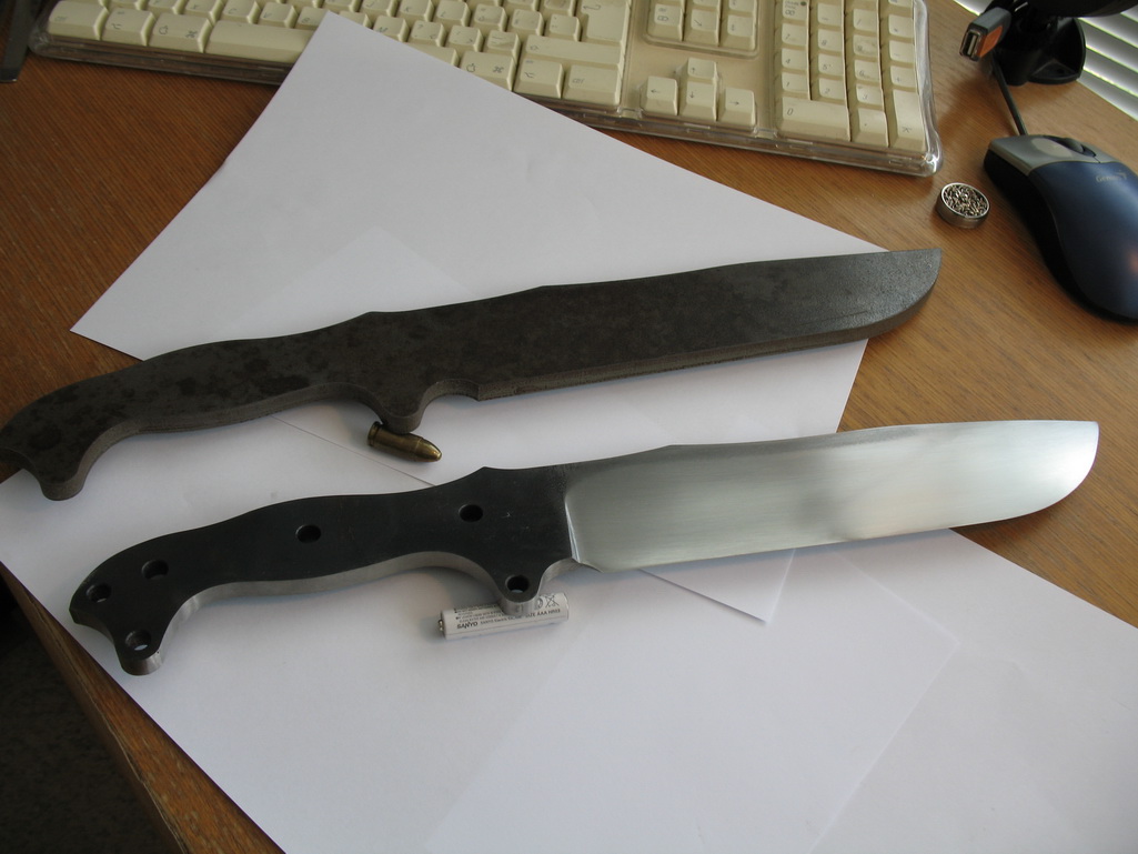 No tak 24.11.2011 jsem za 700kč koupil plát perový oceli 8x150x500 mm, kterej mi poslali z Plzně, pak jsem z toho dostal k Vánocum vodou vyříznutý 2 čepele, to netuším kolik stálo :D no a ruční práce + kalení na týhle čepeli je za 2000 i s poštou....takže zatím jsem na 2350 za čepel a nejakých 200kč, co mi stál materiál na střenky + 200 pro soustružníka, co mi podle výkresu na míru udělal nýtováky na přidělání střenek