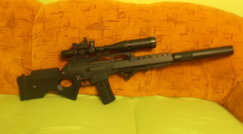 Takže jsem nakonec dal dolů nožičky, které stejně nepoužívám, nainstaloval rukojeť a tlumič nasunul až k předpažbí  A jsem maximálně spokojený...zbraň je prostě těžší, ale na to si zvyknu