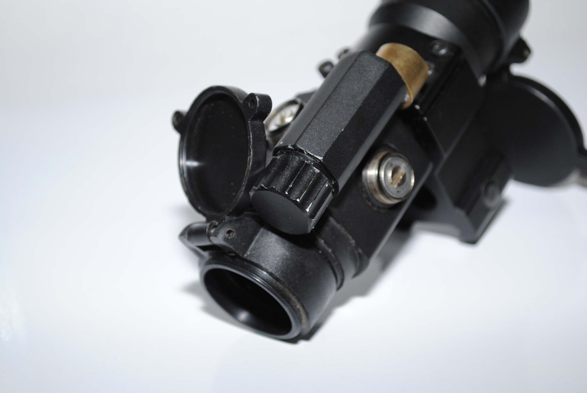 Kamarád mě poprosil o opravu tohoto kolimátoru. Začal špatně fungovat potenciometr - tečka přeblikávala a kolečko při dotyku způsobovalo blikání terče.