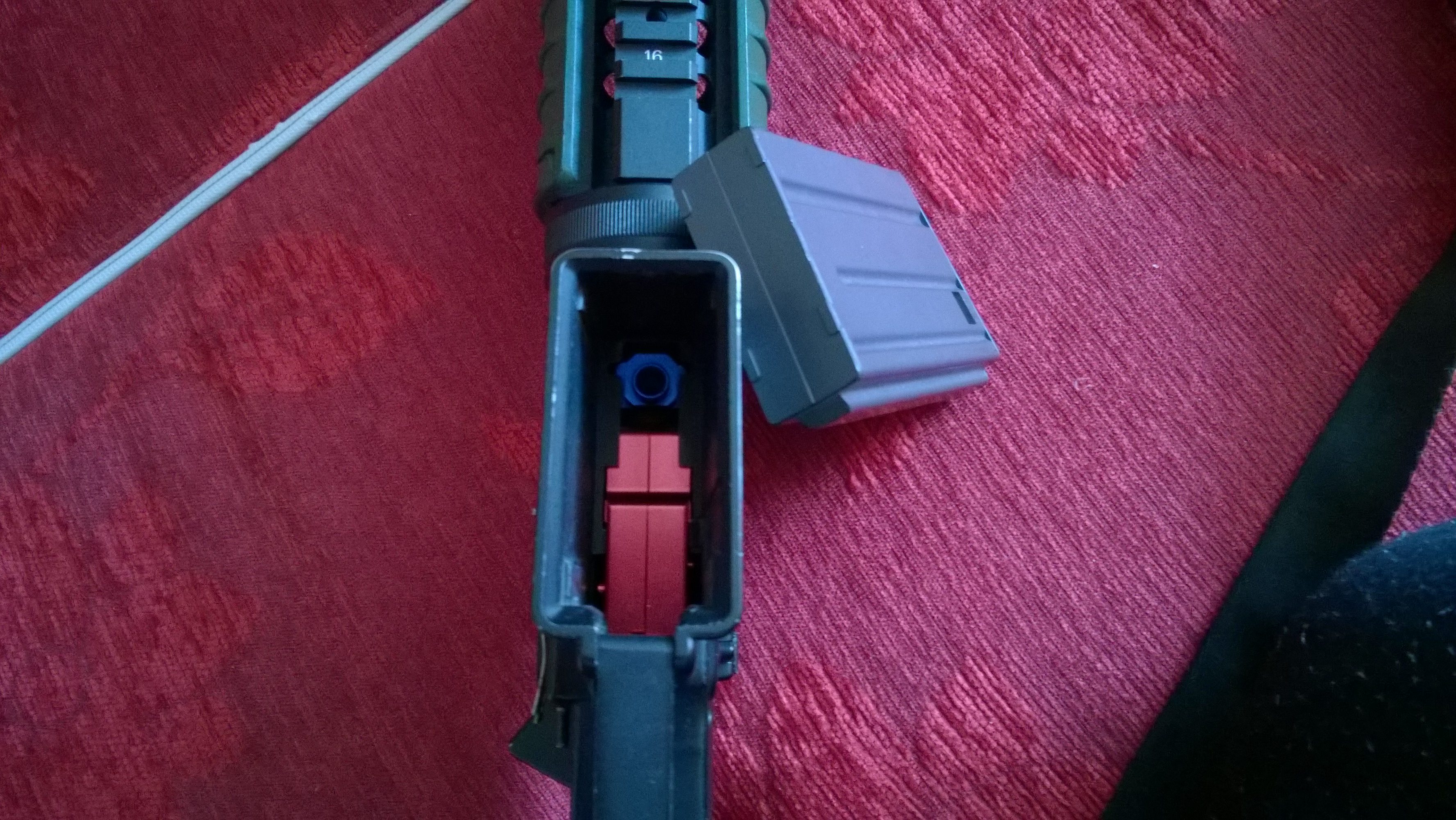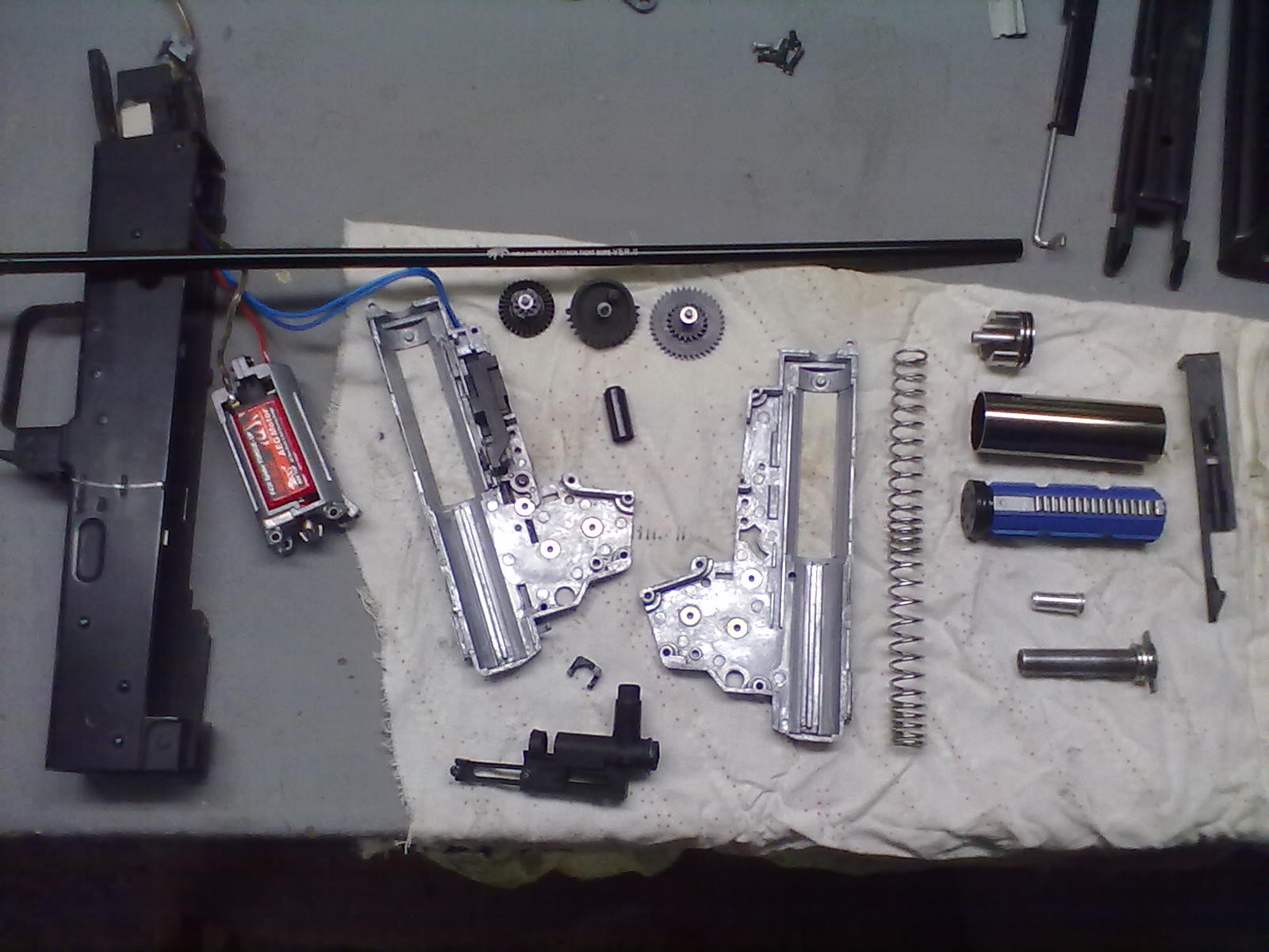 Vnitřek: silnoproudá kabeláž s extrem aktivní brzdou turnigy nanotech 1.2 3S CNC mech SHS, nastříleno asi 2000kulí zátěžová kola shs nevím kolik nastříleno píst s celokovovým ozubením SHS 500 kulí pružina 130 od GD nastříleno 500 kulí vzduch komplet guarder, nastříleno má 500 kulí motor guarder infinity taky 500kulí hopkomora prowin modrá hlaveň prometheus 509mm