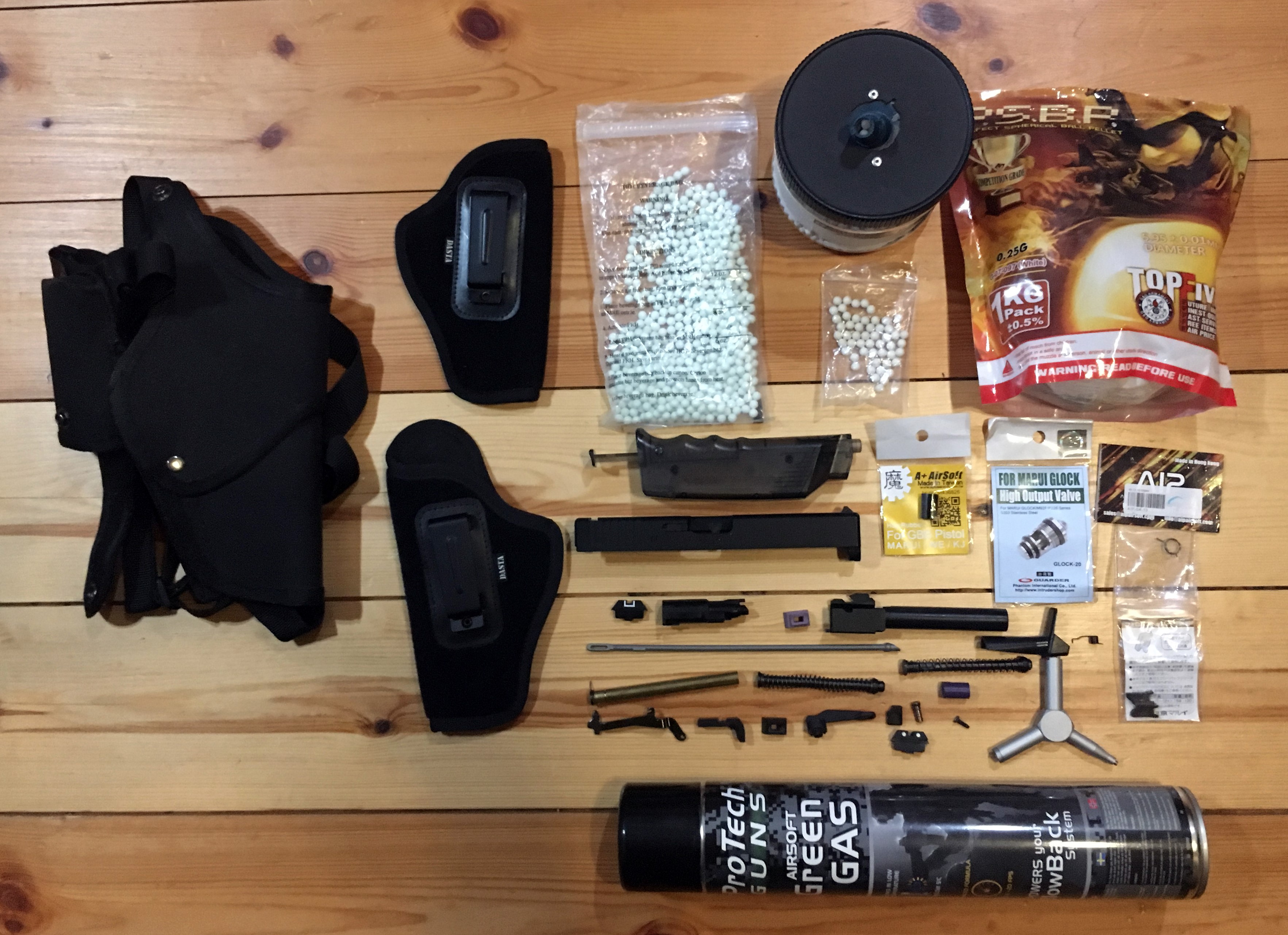 Pôvodné diely boli vymenené za: - záver a vonkajšia hlaveň - Shooters Design Metal Slide & Barrel Set Mk. II - mieridlá - Guarder Steel Night Sight - záchyt zásobníka - Guarder Magazine Catch - vratná pružina záveru a kladivka, vodiaci tŕň - Guarder Steel Recoil Spring Guide Set - výpustný ventil - Guarder High Output Valve - Hop-Up - Nine Ball Air Seal Chamber - plynové vyústenie - Nine Ball Gas Route Sealing Rubber Packing - vnútorná hlaveň - PDI 6.01mm Inner Barrel - valve knocker - Shooters Design Steel Valve Knocker - tryska - AIP Reinforced Loading Nozzle - hlava piestu - PDI Piston Head - a ďalšie...