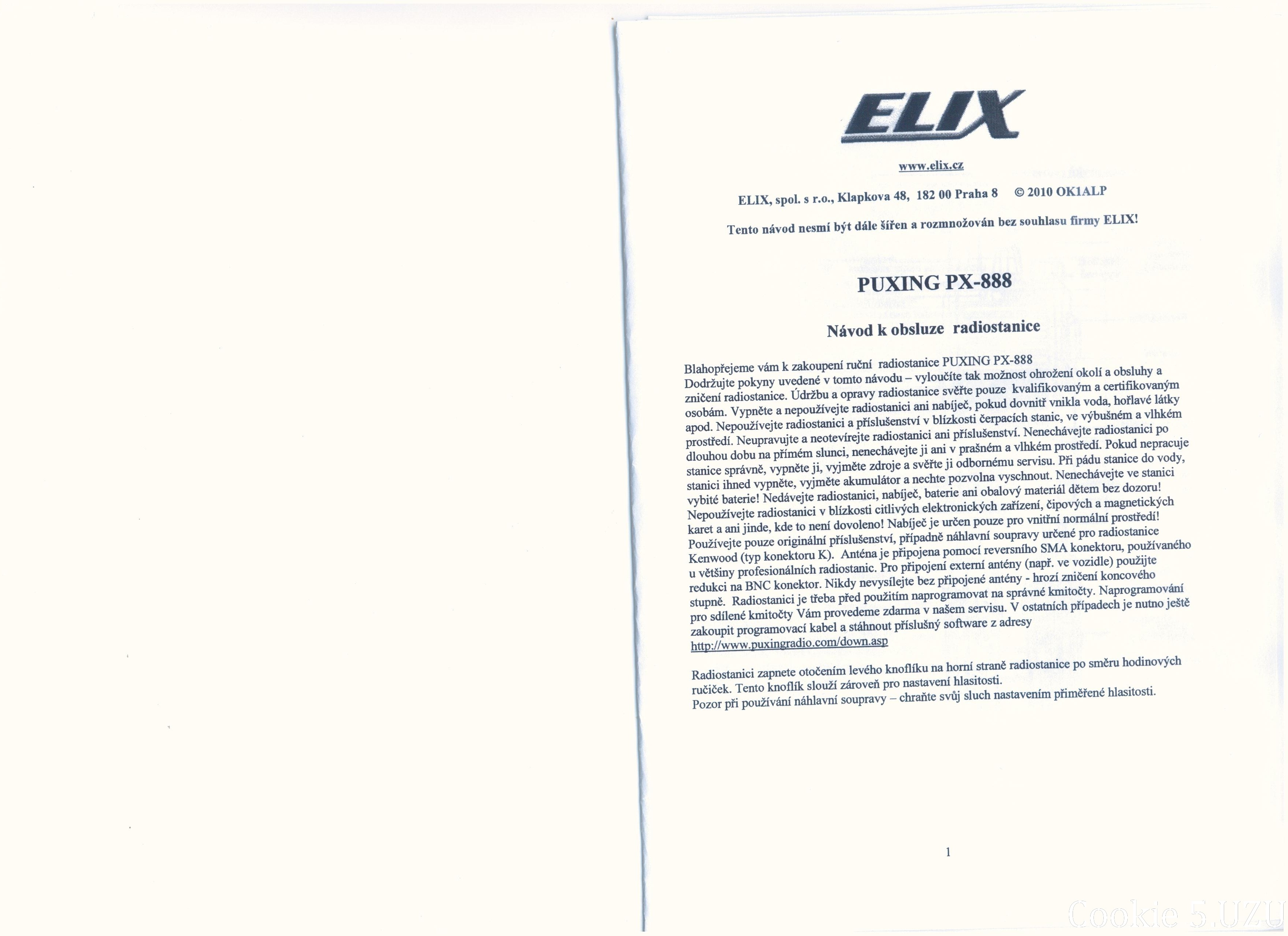 Uživatel Cookie nám prokázal velikou laskavost a poskytl scany českého návodu k velmi oblíbené radiostanici Puxing PX-888. Jsou k dispozici v příloze tohoto příspěvku. Kopírování bez svolení je přísně zakázáno! Já osobně NEJSEM MAJITELEM TÉTO RADIOSTANICE a tudíž mne prosím nekontaktujte s prosbami o pomoc, radu, další materiály a podobně, NEMÁM JAK VÁM POMOCI.