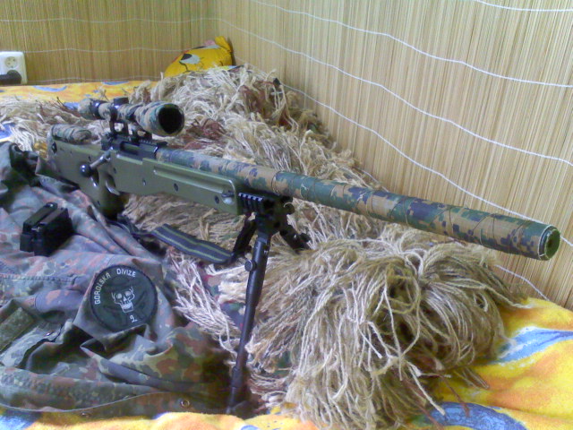 Jo, máš pravdu:-) Sem hňup  a plácám chujoviny http://en.wikipedia.org/wiki/Heckler_%26_Koch_G3Není to juta, je to pro mně mnohem dostupnější- levnější materiál: obvazy  část je bíla-barvená na zeleno / béžovo, část už byla zelená (tuším že ty jsou v obvazech vz.80) Jutu sem kdysi na tohle používal, ale v terénu se to až moc páralo, třepilo a lezlo to ze zbraně dolů, nebo sem měl každou chvíli čočku na optice plnou vláken  s obvazem tohle neřeším ony se rozpářou, zmoknou ale pořád drží, v podstatě tak, že to nemusím sundávat ani při rozborce (jen část která je mezi tlumičem a hlavní, protože pro rozborku musím odšroubovat tlumič) pod tím je ještě barevný nástřik ale vypadalo to divně, takhle se mi líbí víc:-) (podstatný faktor)