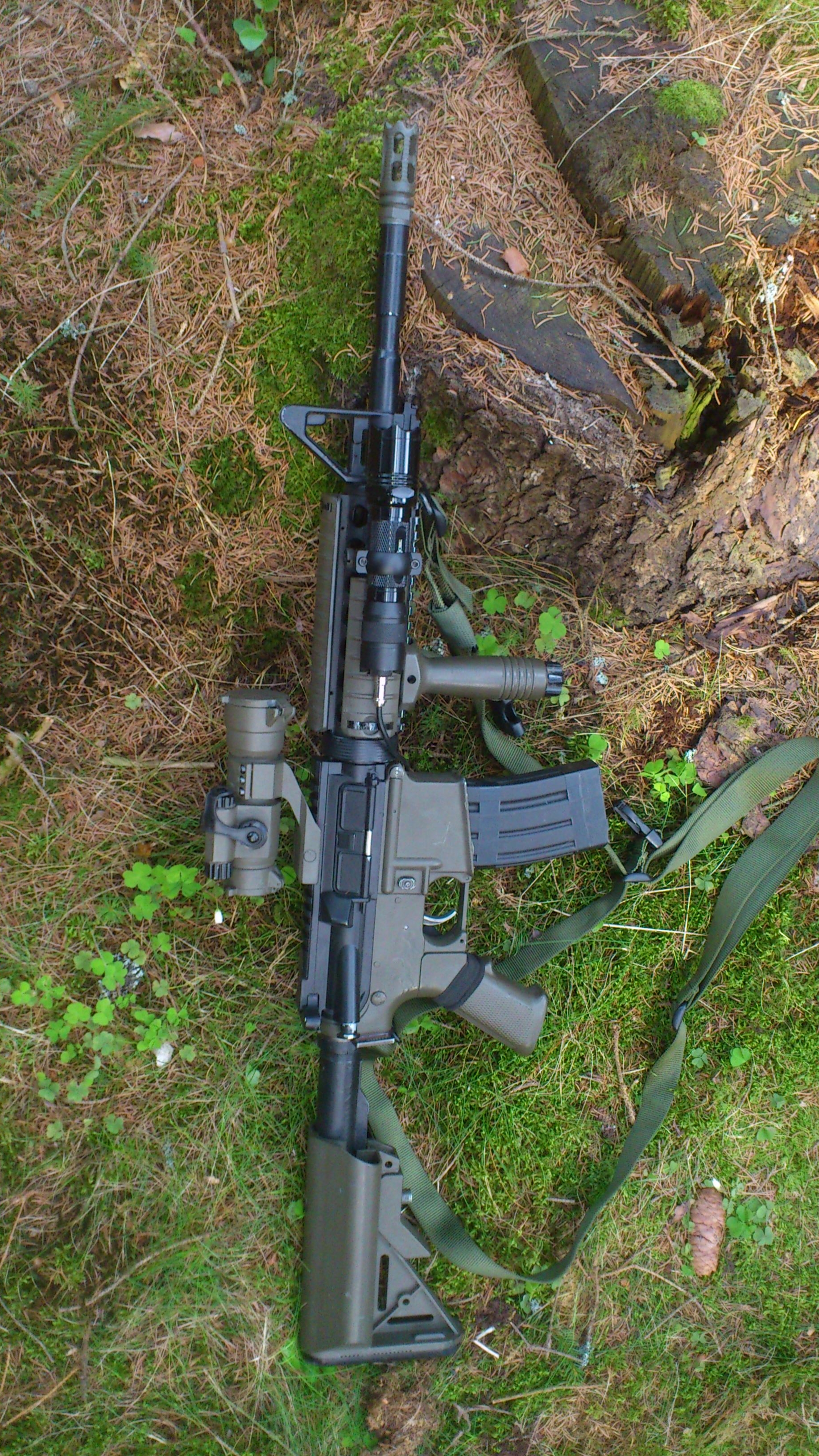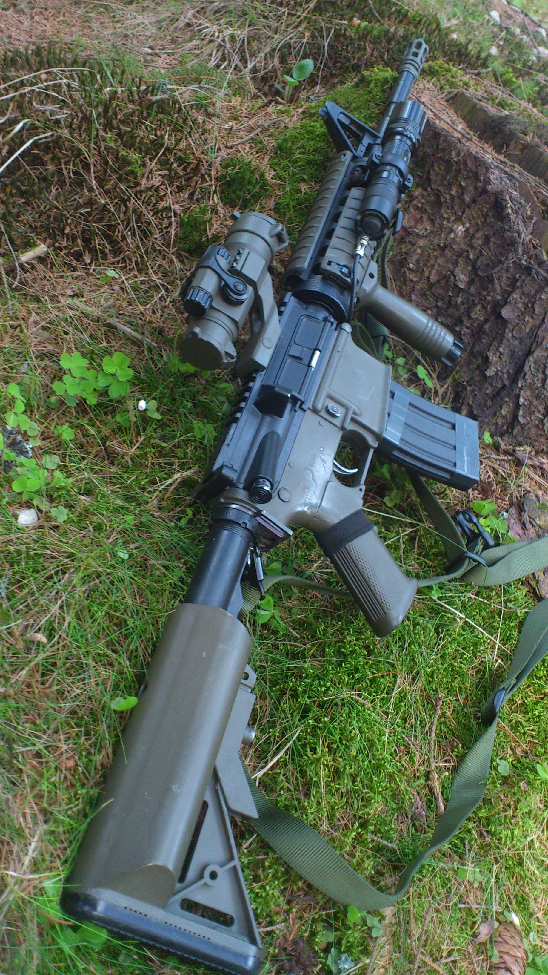 Moje M4CQB-R od DBOYS, dodělaná částečná Bushmaster ražba na šachtě, předělaná pažba. Ke kolimu by to chtělo vysokou montáž. Inspirováno fotku 601. (omlouvám se za kvalitu fotky)