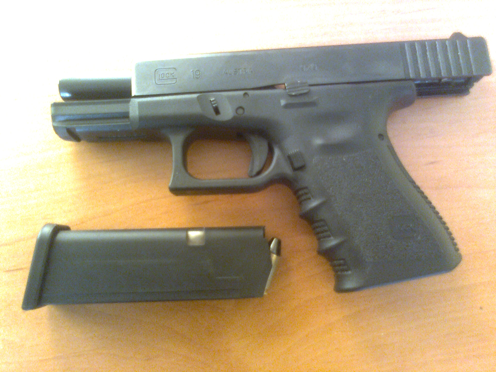 Přidám mizerné foto nového kousku výzbroje. Stařena (cz83) šla na řez a místo ní od minulého týdne tahám Glock 19. Je to kovový/plastový miláček, takže sem patří;-)
