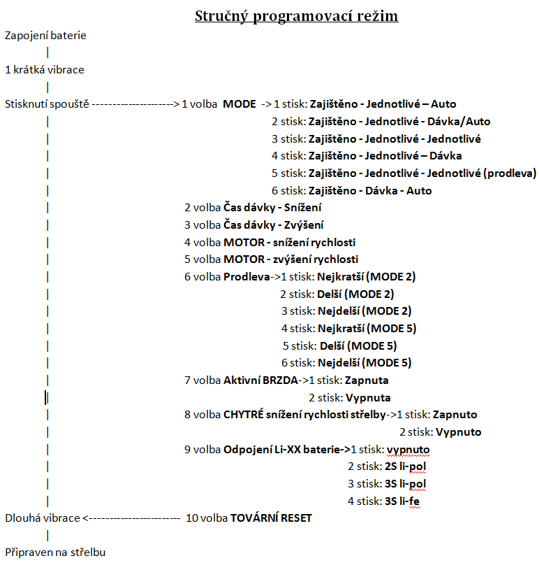 Procesorovka ma navic regulaci prodlevy mezi davkou/auto (mode 2) a mezi semi vystrely (mode 5). Konecne cele programovaci menu viz foto v priloze