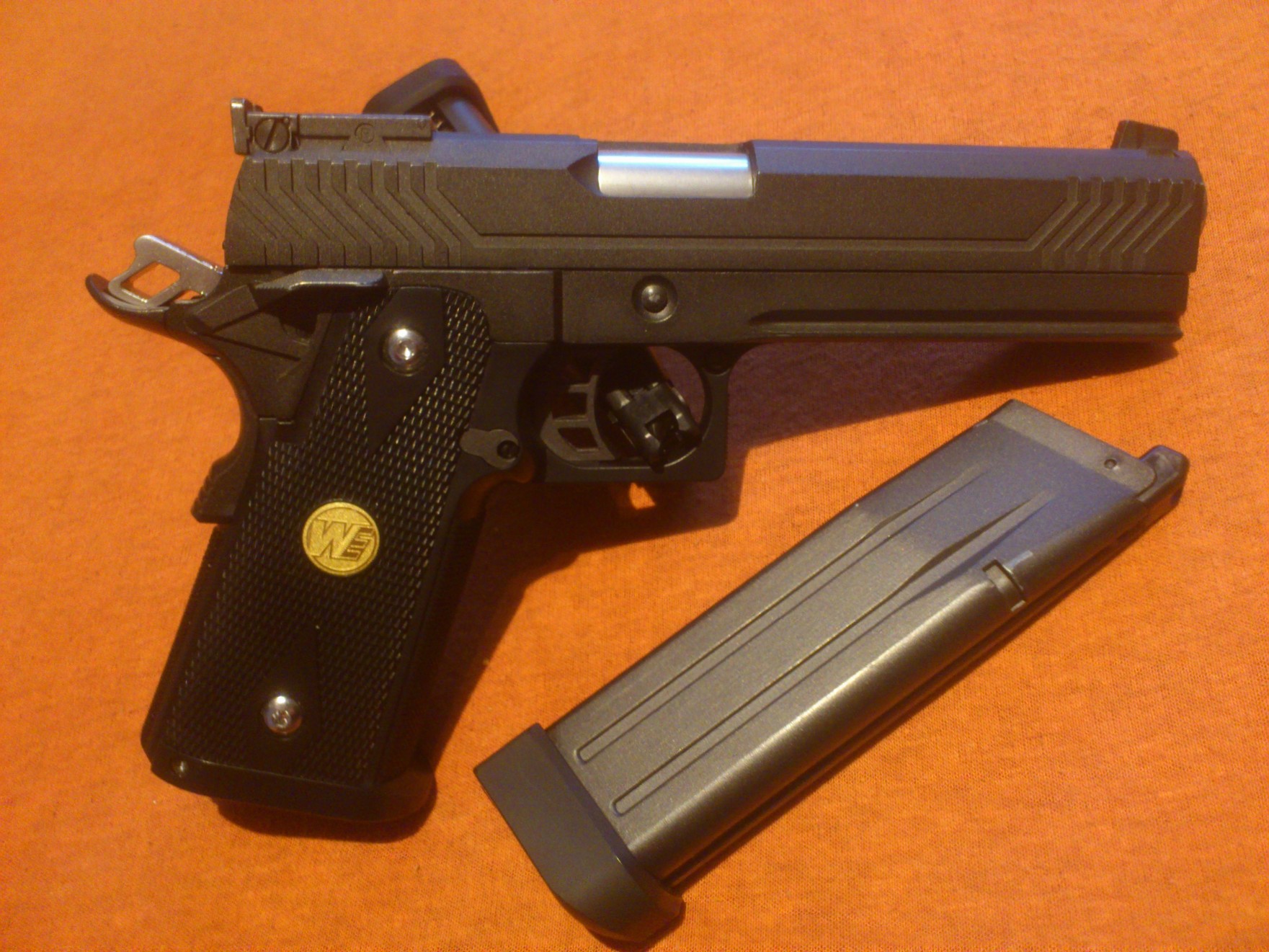 Hi-Capa 5.1 chrom Originální povrchovka kovových částí nic nevydrží, v současnosti jsou všechny kovové díly začištěny od otřepů, okartáčovány a vyleštěny dremlíkem. Klasické úpravy gripu v oblasti lučíku, původní povrch opájkován, doplněny šroubky a magwell. Co se týká ostatních úprav, tak prozatím skromně, upraveny originální ventily v zásobnících, zásobníky dostaly fialové gas route nineball. Světlovodná muška, odlehčený plug a 150% bicí pružina, momentálně je instalována originální vratná pružina, se silnější a plynem 144a nefungovalo stoprocentně nabíjení. Zip