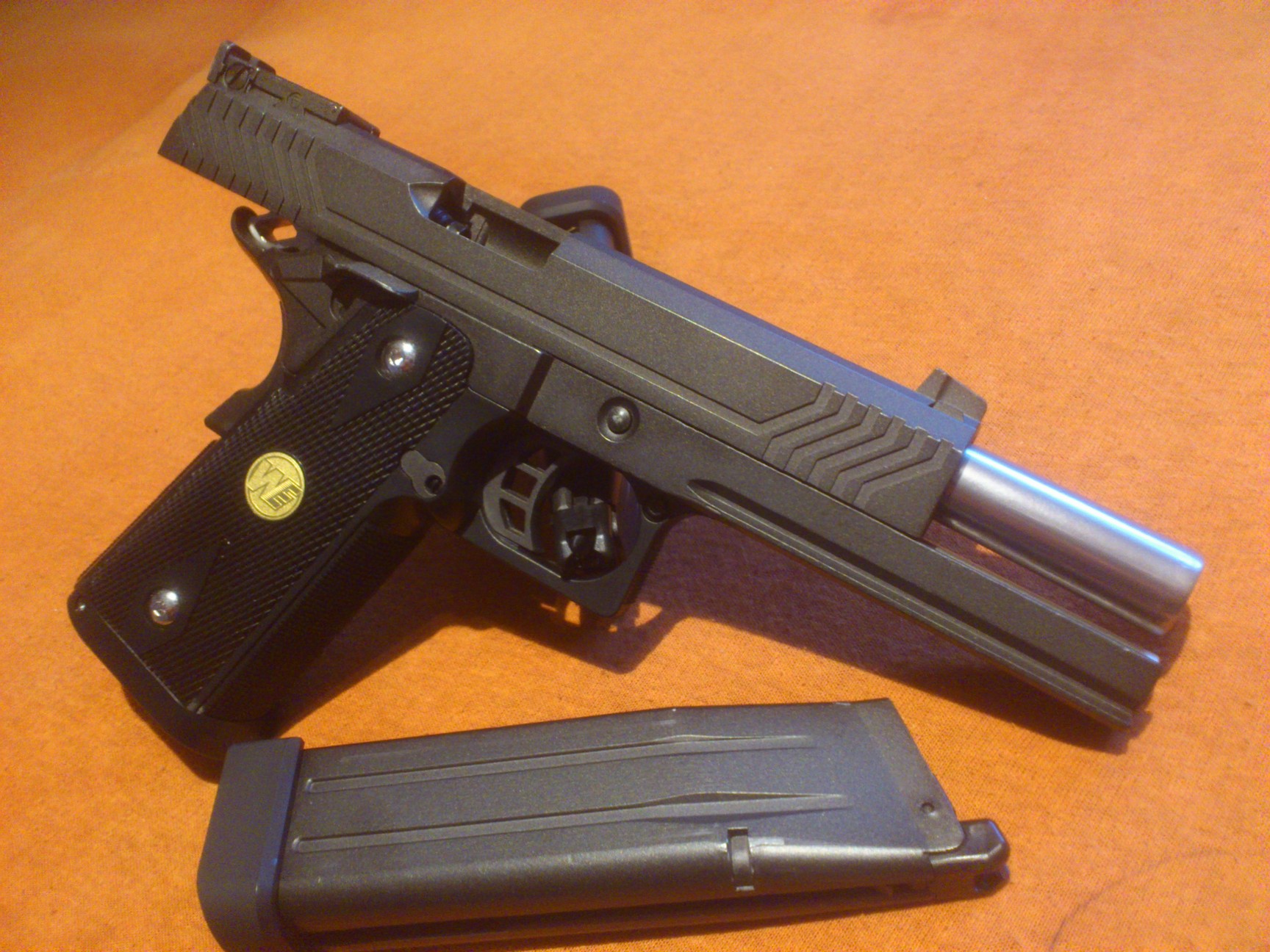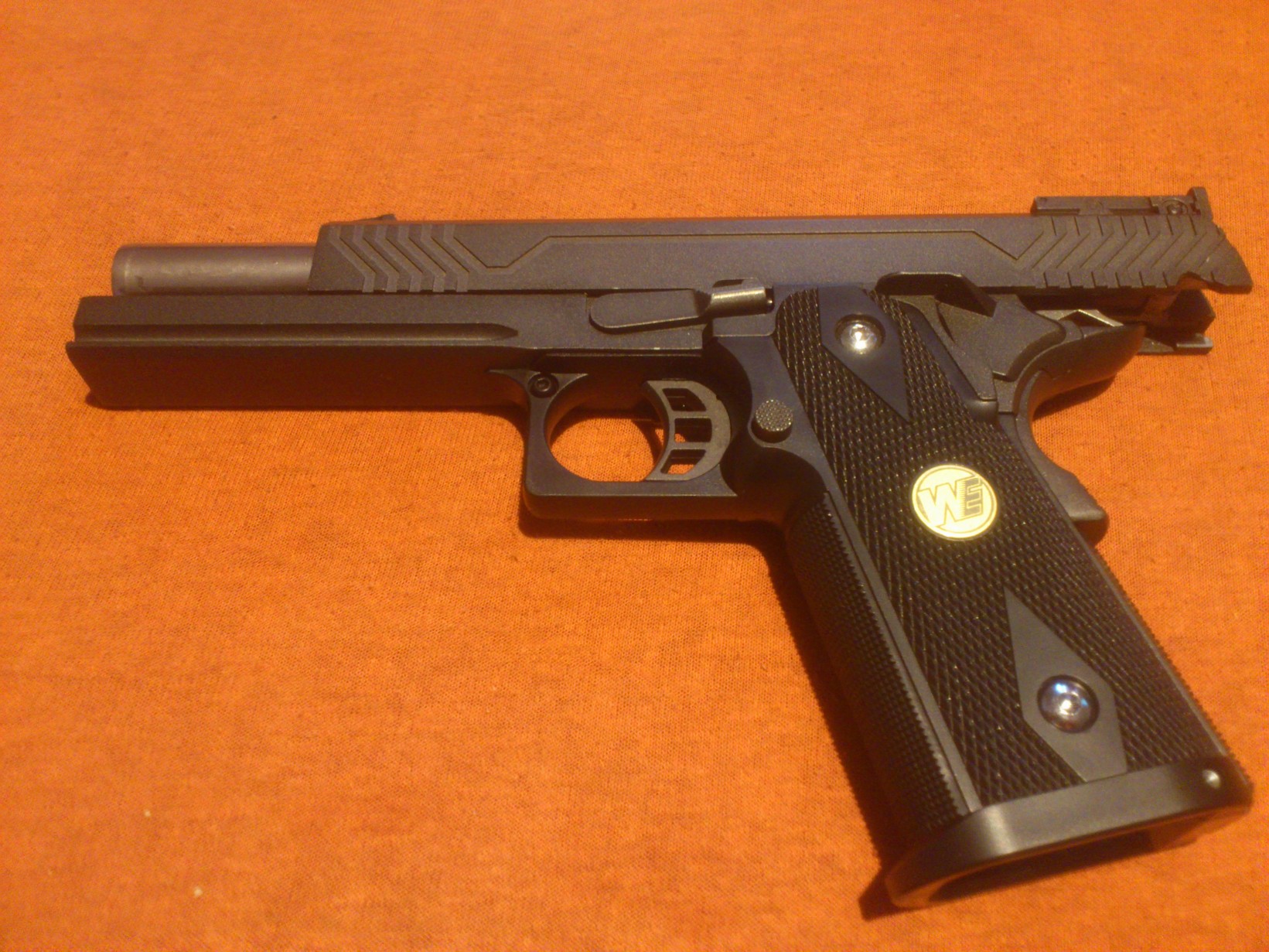 ...            No a tohle je můj sen V průběhu času jsem zatoužil po celokovu a oslovil mě design brazilského puškaře La Bramy. Náhodou jsem narazil na výrobce, který závěry v podobném designu dělal. Měl jsem také štěstí, že v tu dobu probíhali velké slevové akce a výprodeje, takže se dalo hodně ušetřit, na řadě dílu 50 % původní ceny. UpgradeRám - Davidson Custom La Brama Závěr - Davidson Custom La Brama Hlaveň - Davidson Custom La Brama Vnitřní hlaveň - Tanyo Koba Twister 6,04 mm Hop Up guma - Fire Fly SOFT Vodící tyč vratné pružiny - PROG4 Pera - AIP 160 % Blowbeck - Davidson Custom Tryska - Shooters Design Vratné pero trysky - AIP 120 % Přepouštěcí ventil - C.C. Power Up Cylinder Bulb for Marui M1911A1 Kohout - SVI 5KU ocelový Diskonector - 5KU ocelový Pojistka - Nine Ball Záchyt závěru - Nine Ball Bobří ocas - Noname Spoušť - PROG4 Muška světlovodné vlákno - 5KU Grip - WE red Magwell - PROG 4 STI Šrouby - AIP Záchyt závěru - ? Thumb stock - 5KU. Používaný plyn Ultrair. Na láhev dá kolem 2000 ran. Používané střelivo 0,25 g G&G. Před přetěsněním dávala kolem 310 FPS. Energie kolem 1,1 J. Zbraně jsou stavěné spíše na přesnost než výkon.