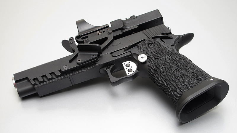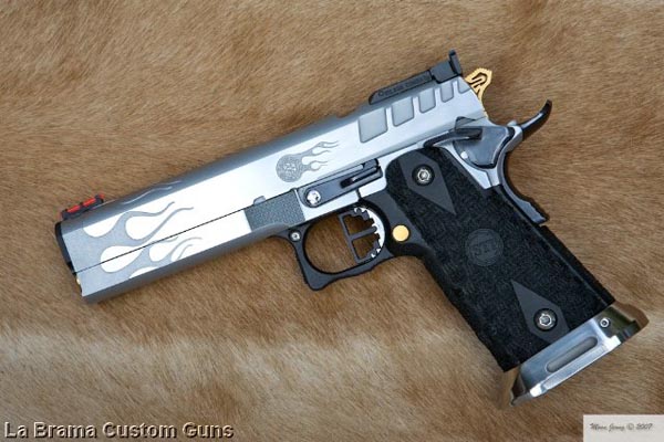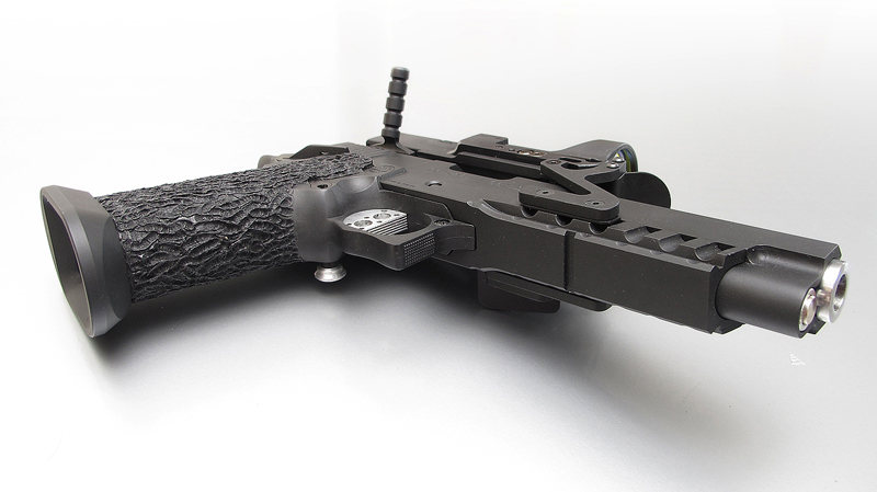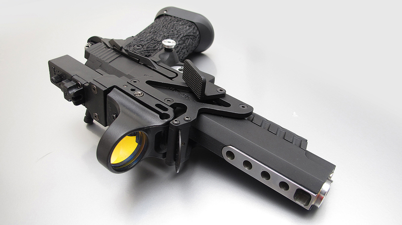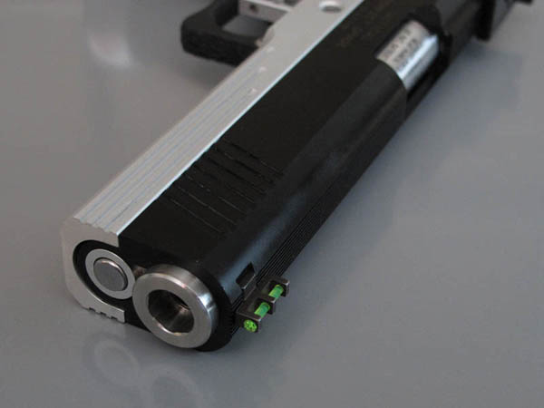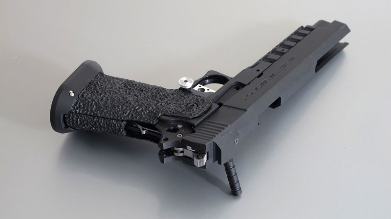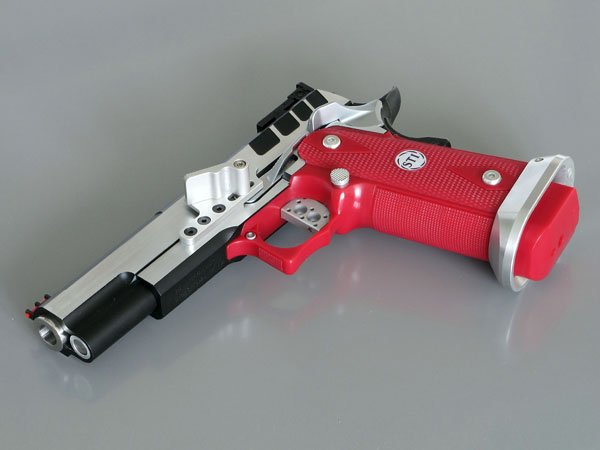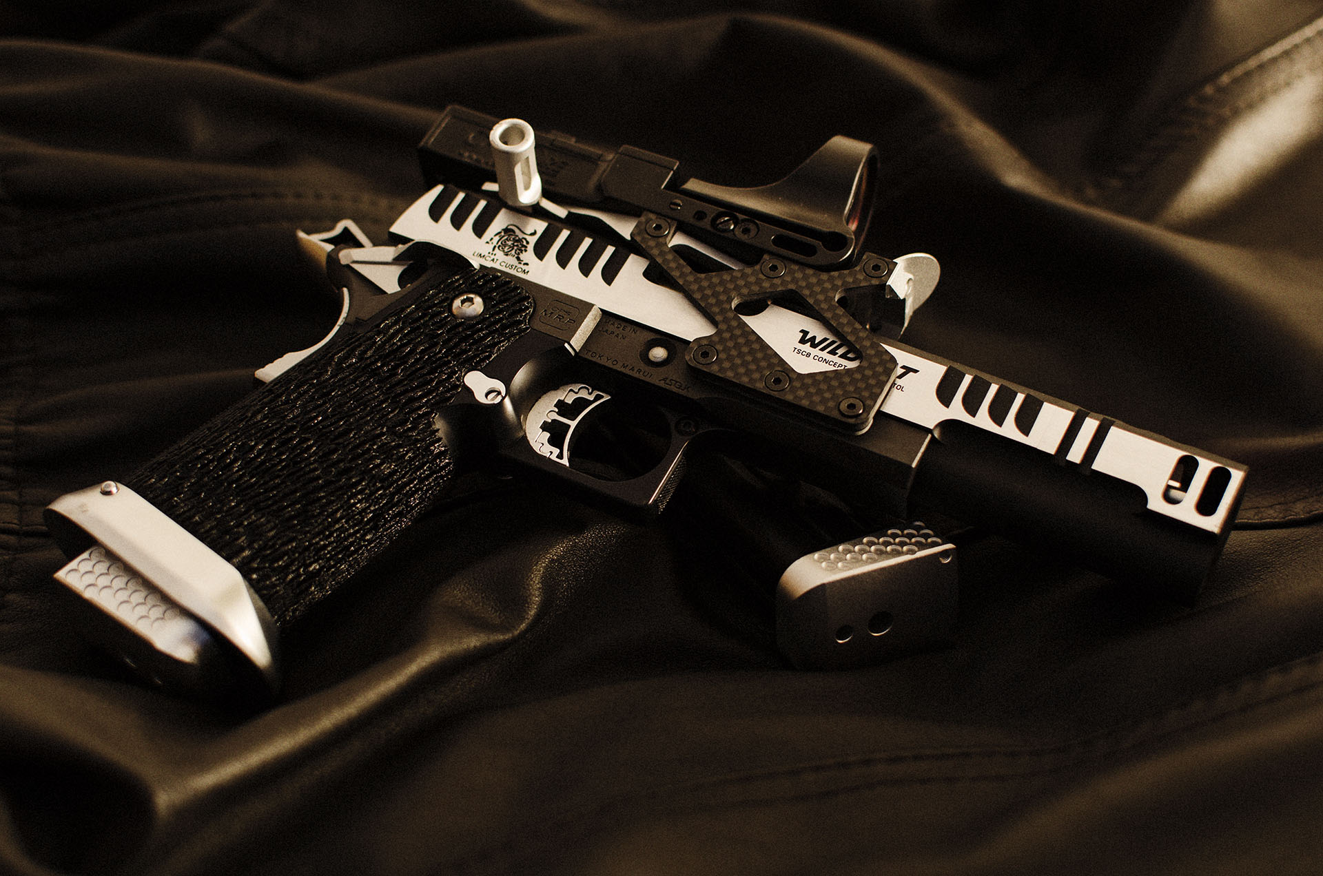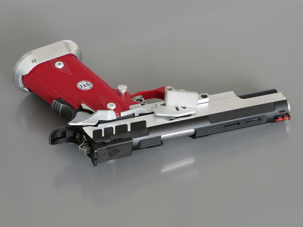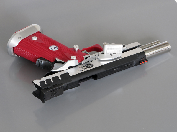 TM Hi-capa 5.1 - Limcat custom Gunsmith - Mike Cripps - EnglandZáver - ProHandgun Limcat Wildcat custom 6" + kompenzátor + oceľová vonkajšia hlaveň Rám - Tokyo Marui Hi-capa 5.1 čierna so striebornými ovládacími prvkami Elite Custom - 6" nerezová vnútorná hlaveň 6.02 mm ProHandgun duralová nastaviteľná spúšť - odpor 0,9 kg ProHandgun oceľové kladivo STI style magwell AIP loading nozzle NineBall HopUp AIP Blowback light unit Guarder springs 150% C-more replika AIP carbon montáž na optiku Elite Custom grip duralová naťahovacia páka hammer plate (ochrana záveru pred odtlačením od kladiva) duralový thumb rest AIP magazine bases - duralové - strieborné Skrátený chod záveru - short stroke buffer