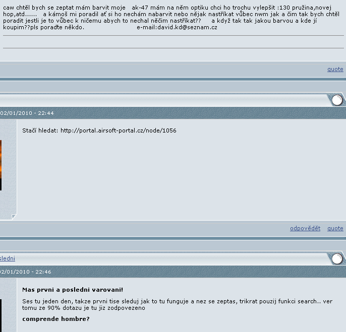 (Nehledě na to, že snad nikde na netu není dobrá poradna pro začátečníky nebo opravdu dobré informační středisko airsoftu. Vždycky je jednodušší chovat se arogantně a mít přístup "takhle to je a my to nebudeme měnit". Pak si ale nestěžuj.