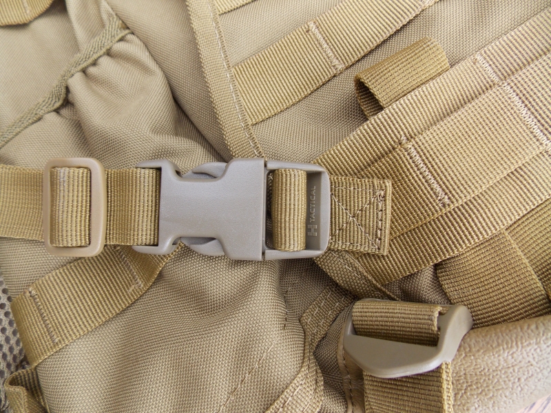 Spony sú označené „Htactical“ googlením som našiel firmu ktorá sa zaoberá taktickou výstrojou no nie je isté či je tam priama spojitosť. Všetky spony ale sú dostatočne mohutné aby zvládali určenie v danej časti batoha. hustotou/odtieňom plastu sa podobajú sponám na taktickom opasku od Pantac-u ( ten mi poslúžil veľmi dobre a spoľahlivo). S ohľadom na cenu ale pochybujem že to bude Duraflex...