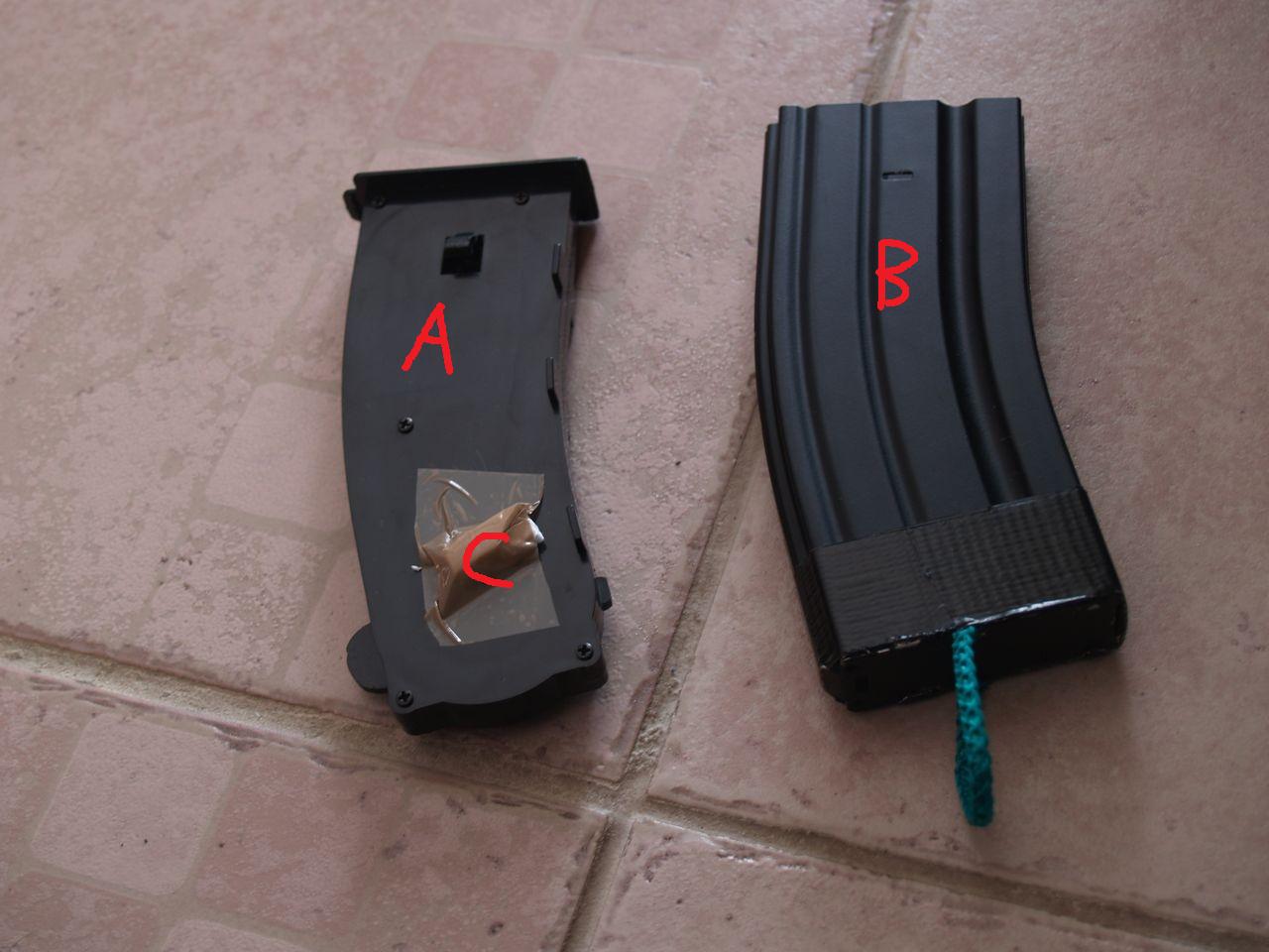 B2. dal jsem vytahovací provázek (pullout) na do zásobníku - lehce se pak vytáhne ze sumky, a také se dá zavěsit na karabinu na výstroji (nemusíte jej nechávat na zemi a nebo těžce dávat zpět do těsné sumky - dělali to tak například jednotky Rangers )