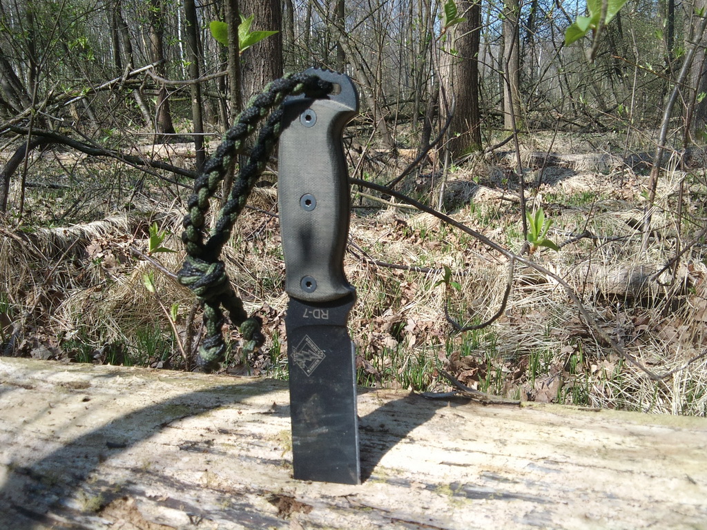 Pro inspiraci, pár fotek mýho půlkilovýho mazlíka Je to velkej pracant z uhlíkovky.....jedinym seknutim se dá useknout 3-4cm silná syrová větev, s trochou trpělivosti lze pokácet strom(dub) kolem 15cm v průměru, naštípat špalky na oheň a s naprostou zručností seká kosti, krájí maso, cibulku i bůček před grilovánim  .......a na konci náročnýho dne pořád holí chlupy na předloktí Ranger RD-7 by Ontario