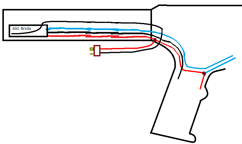 No... taky se mi víc líbí verze s tím že bych do víčka co se zasunuje před trn udělal díru na kabely kde by po kousku byl hned konektor a otočila by se kapsička, tam když by se pažba zasunula a tak by se kabel ohnul nahoru obloučkem ale ničemu by to nevadilo. Problém je jen v tom, kam umístit tu brzdu. To jak jsem nakreslil by bylo tak že bych vytáhnul kabely od motoru na délku trnu, za ním bych je ustřihl, napájel brzdu, ohnul kabely a zamáčkl do trnu. Z toho už by vedly kabely na délku vytažené pažby. Raši bych to ani do toho trnu netahal, ale nevim kam bych dal tu brzdu :/