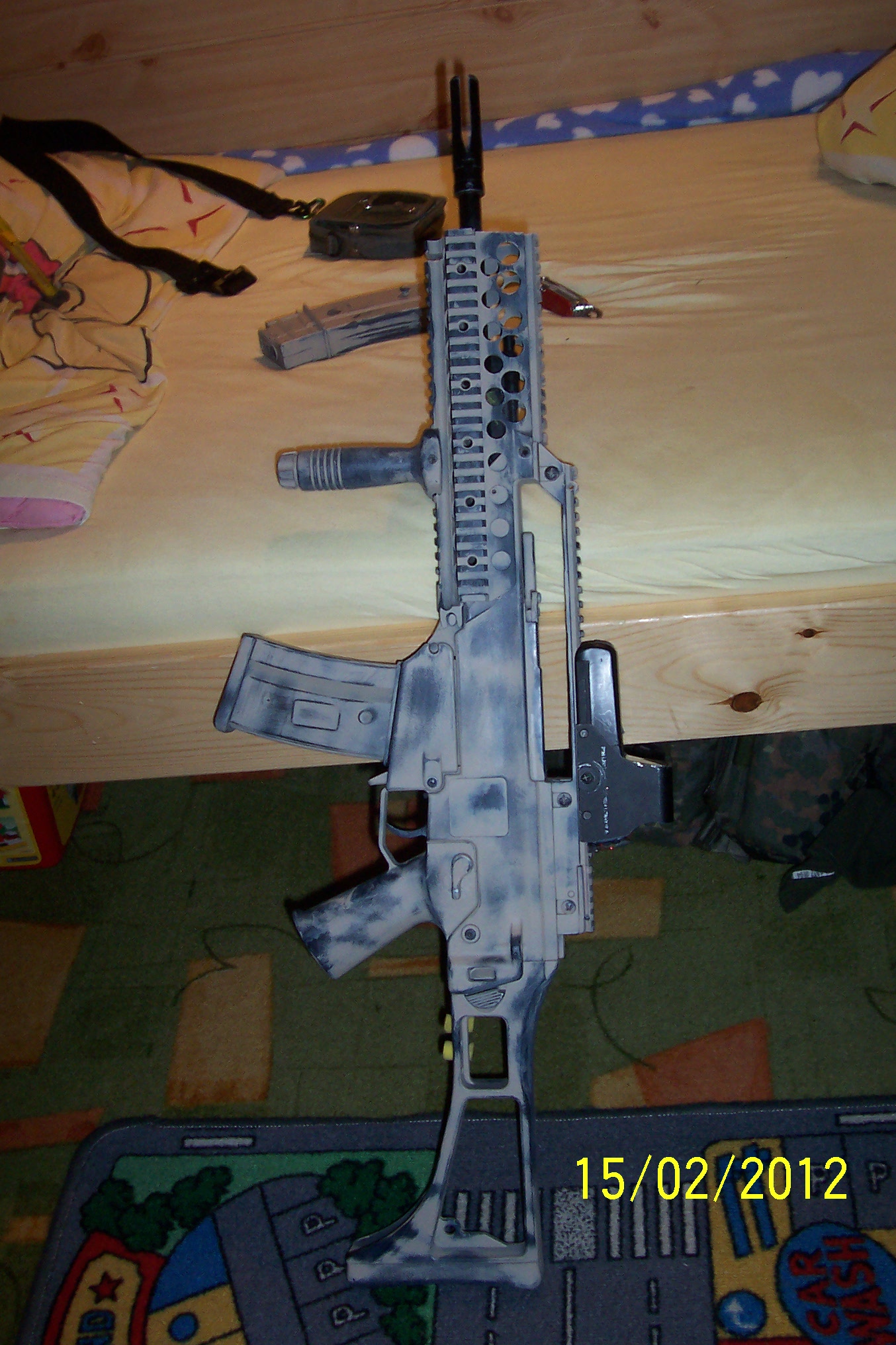 Jo, máš pravdu:-) Sem hňup  a plácám chujoviny http://en.wikipedia.org/wiki/Heckler_%26_Koch_G3Není to juta, je to pro mně mnohem dostupnější- levnější materiál: obvazy  část je bíla-barvená na zeleno / béžovo, část už byla zelená (tuším že ty jsou v obvazech vz.80) Jutu sem kdysi na tohle používal, ale v terénu se to až moc páralo, třepilo a lezlo to ze zbraně dolů, nebo sem měl každou chvíli čočku na optice plnou vláken  s obvazem tohle neřeším ony se rozpářou, zmoknou ale pořád drží, v podstatě tak, že to nemusím sundávat ani při rozborce (jen část která je mezi tlumičem a hlavní, protože pro rozborku musím odšroubovat tlumič) pod tím je ještě barevný nástřik ale vypadalo to divně, takhle se mi líbí víc:-) (podstatný faktor)