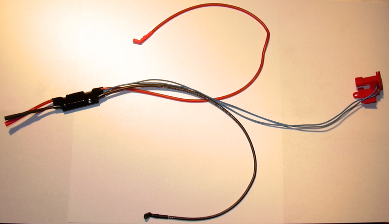 Na fotce je na zakázku vyrobená kabeláž pro zbraň M4a1 s baterií uvnitř předpažbí. Spoušťové kontakty byly použity původní ze zbraně.