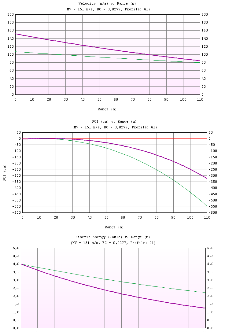 Neměl by být velkej problém to spočítat, balistickej koeficient je jasnej, tak bysme mohli exaktně jednou pro vždy spočítat jak je to s tím zachováním energie kuličky v různý vzdálenosti, ne? Vezmněme shodnou úsťovou energie E0=4J. Máme dvě kuličky o hmotnosti 0,35g a 0,7g. (nižší hmotnost jsem do výpočtu nemohl použít, ale princip je stejnej, rád bych porovnal 0,12g a 0,4g, ale nejde to). Lehčí vyletí z hlavně rychlostí v0=151m/s, těžší rychlostí v0=107m/s. Lehčí kulička bude mít ve dvaceti metrech energii E20=3,3j, druhá bude mít energie E20=3,6J. Ve větší vzdálenosti to bude E50=2,4J a E50=3,1J. Závěr je že těžší kulička i přes nižší počáteční rychlost ztrácí energii o poznání pomaleji. Co se týká změny rychlosti a propadu střely (dostřelu), tak jsem vám k tomu udělal i obrázek Fialová je lehčí, zelená je těžší. Na prvním grafu je rychlost, na druhým propad střely a na třetím energie. Čísla nemusej uplně přesně sedět, protože použitý funkce odporu vzduchu nejsou pro takto nízký rychlosti uplně ideální, ale v podstatě by to mělo docela dost odpovídat realitě. Závěr? těma těžšíma to asi fakt může víc bolet  PS: jestli mi někdo napíše že to není airsoft a že tam není hopup, tak fuck off, princip je furt stejnej.