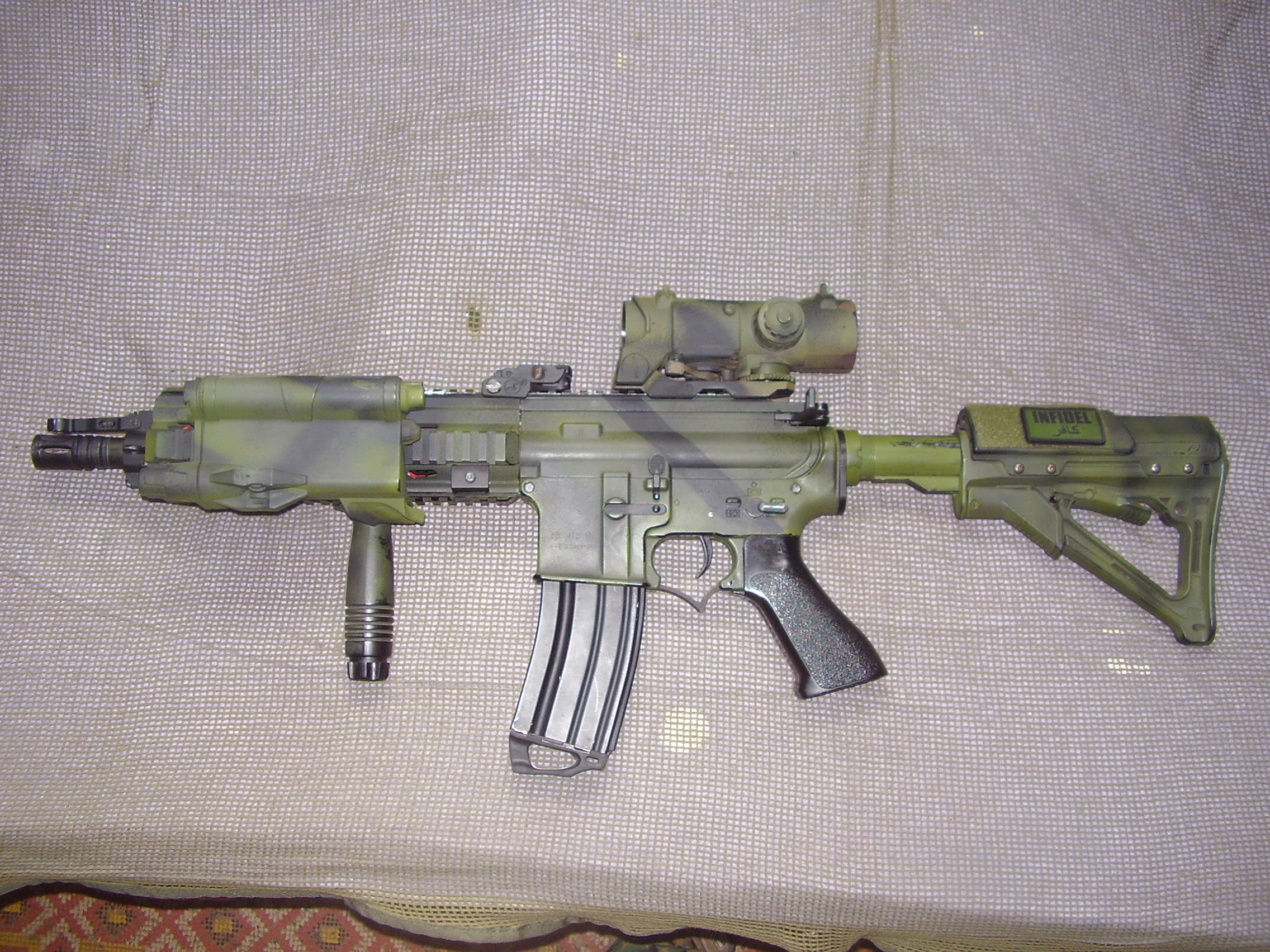 Mk. 18 mod O (M4 CQBR) Proč máš u tý kosy ten eotech v tom nejvíc nesmyslným místě jaký jde vymyslet? Zaručuju ti že tohle by v reálu nestřílelo. já vim no.  Tahle montáž je na AK. Nad závěr mi nejde dát protože hned pod ním vede pružina na vracení závěru a předpažbí není v rovině.